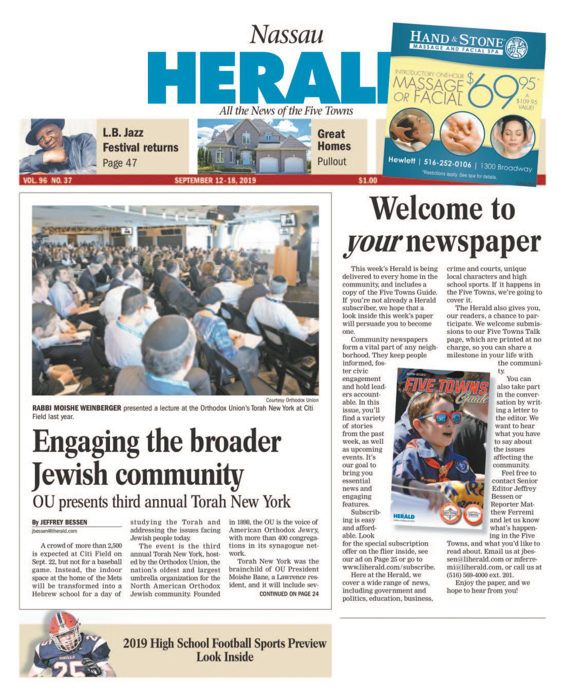 We would like to start by congratulating the Nassau Herald for reaching this huge milestone. The Nassau Herald has been the community newspaper for all of these decades — when we established Chabad in the Five Towns in 1995, it was the community newspaper and still remains a very distinct community newspaper.