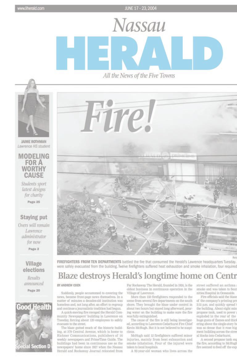 Nearly 22 years ago, a massive fire destroyed the Nassau Herald newspaper office and printing plant in Lawrence, collapsing the roof and burning for several hours. The blaze broke out on June 15, 2004, at the Richner Communications building on Central Avenue. Officials said the fire began around 3:20 p.m. in the printing room.