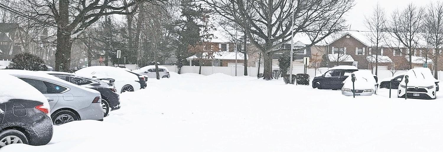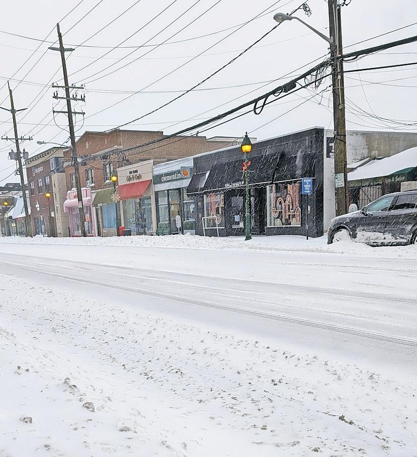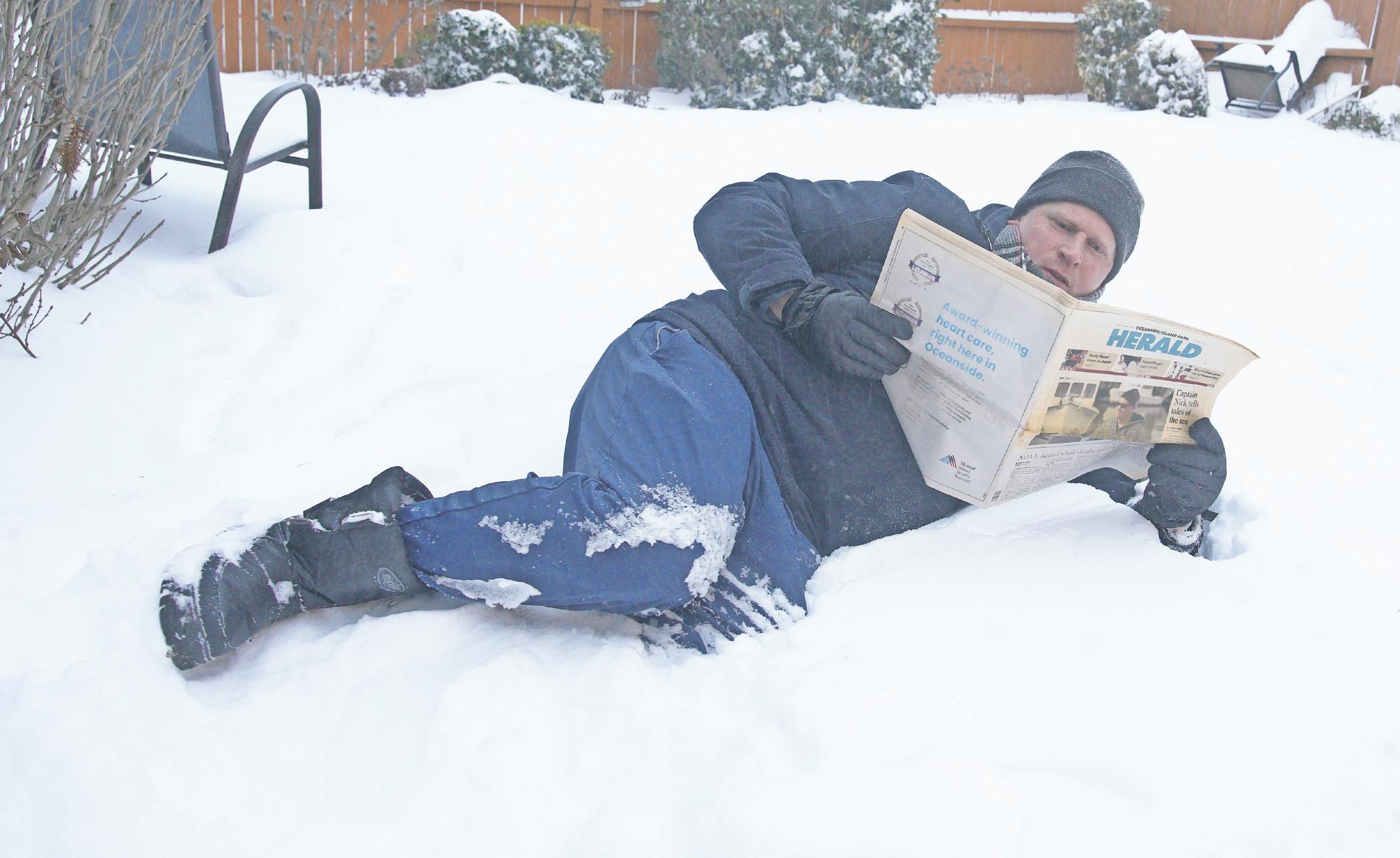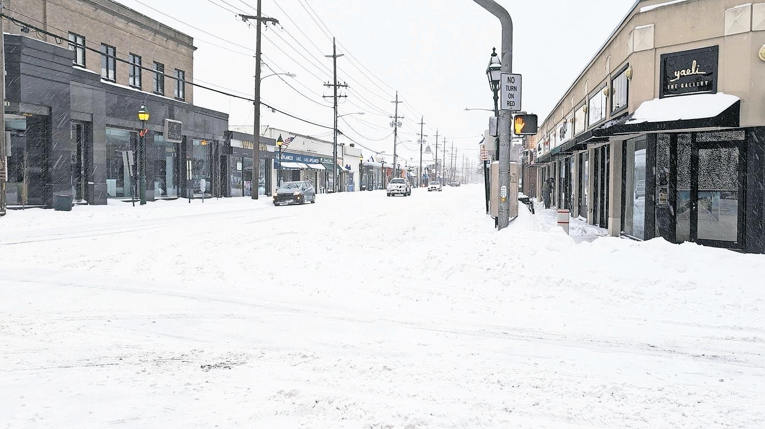 Residents of the Five Towns and Atlantic Beach were snowed in on Sunday, as 8 to 12 inches fell during the storm that stretched across a wide swath of the U.S. Above, Zachary Parker, of North Woodmere, cooled off after shoveling on Monday. At right, on what normally would have been a busy Sunday of shopping along Central Avenue in Cedarhurst, the street was deserted. As the post-storm cleanup continued, temperatures were expected to stay well below freezing into next week.