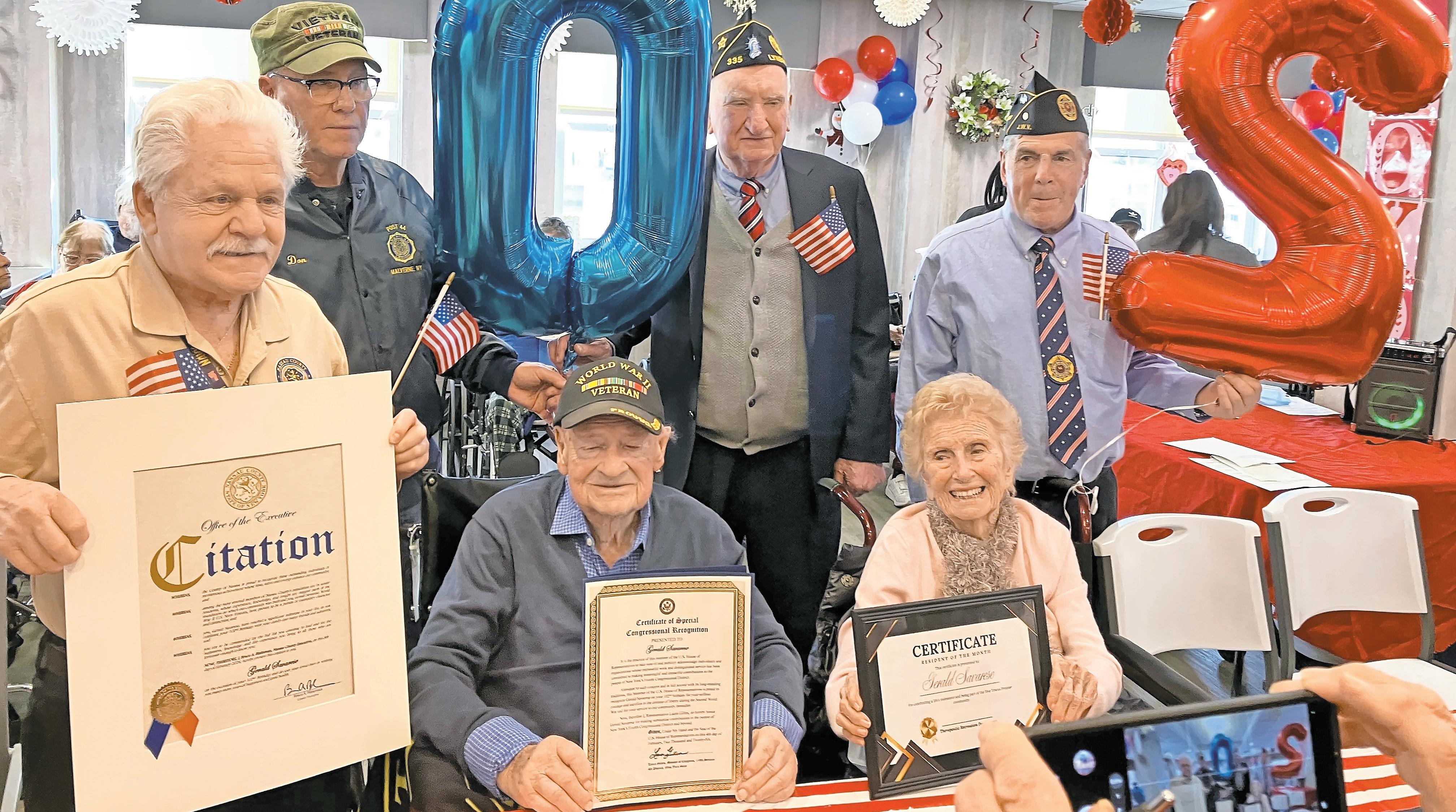 Gerald Savarese, a Navy veteran who served in World War II, marked his 102nd birthday on Feb. 4, surrounded by family members, fellow residents and caregivers at a patriotic celebration at Five Towns Premier Rehab and Nursing Center in Woodmere.