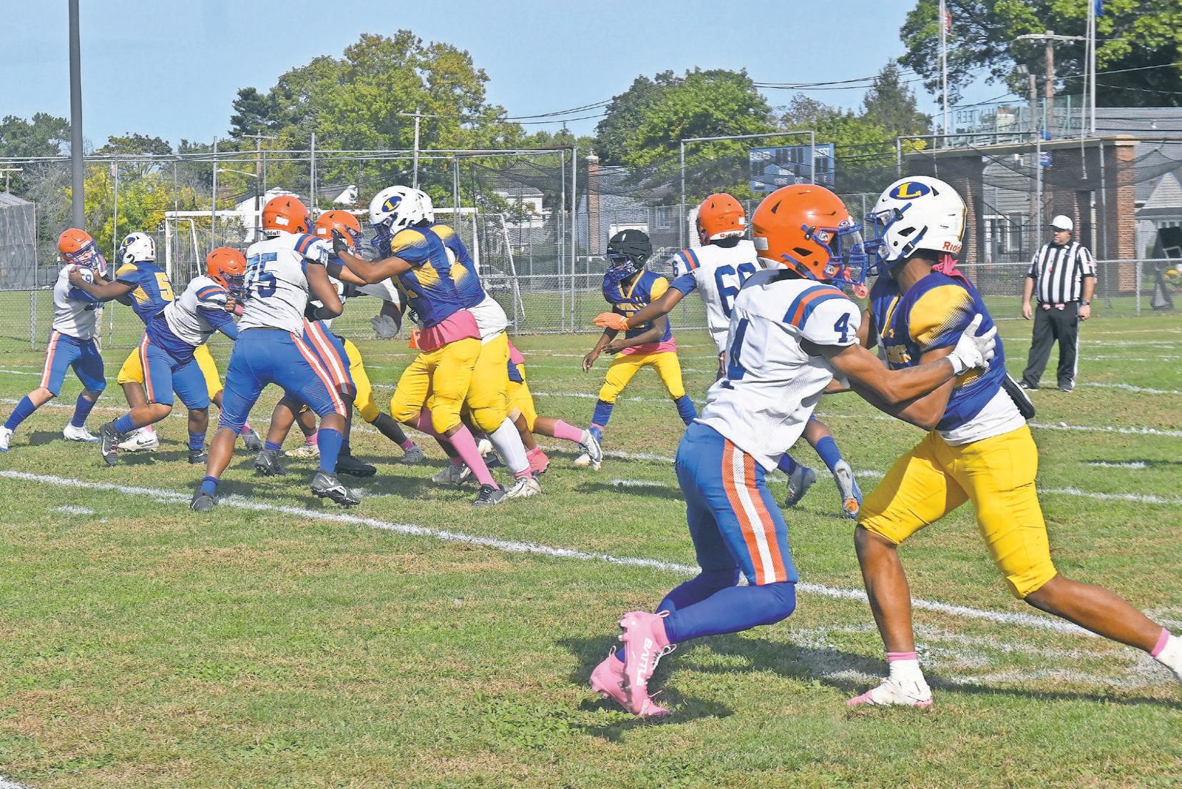 The Lawrence High School Golden Tornadoes played their Homecoming game against the Malverne Mules at Fireman’s Field in Valley Stream last Saturday. At right, Lawrence’s varsity cheerleaders roused the crowd, which included district residents, students and faculty. Story, more photos, Page 10.