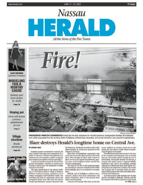 Nearly 22 years ago, a massive fire destroyed the Nassau Herald newspaper office and printing plant in Lawrence, collapsing the roof and burning for several hours. The blaze broke out on June 15, 2004, at the Richner Communications building on Central Avenue. Officials said the fire began around 3:20 p.m. in the printing room.