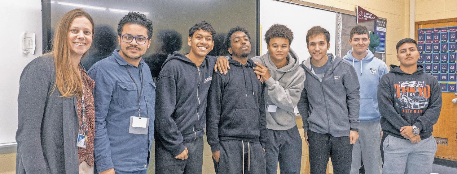 Teacher Lauren Kueper, left, had students Dan De La Rosa, Araf Nokib, Jayden Major, Oliver Safo, Michael Facciola, Zach Shapiro and Favio Goytizolo Cisneros present their projects for the class on Oct. 14.