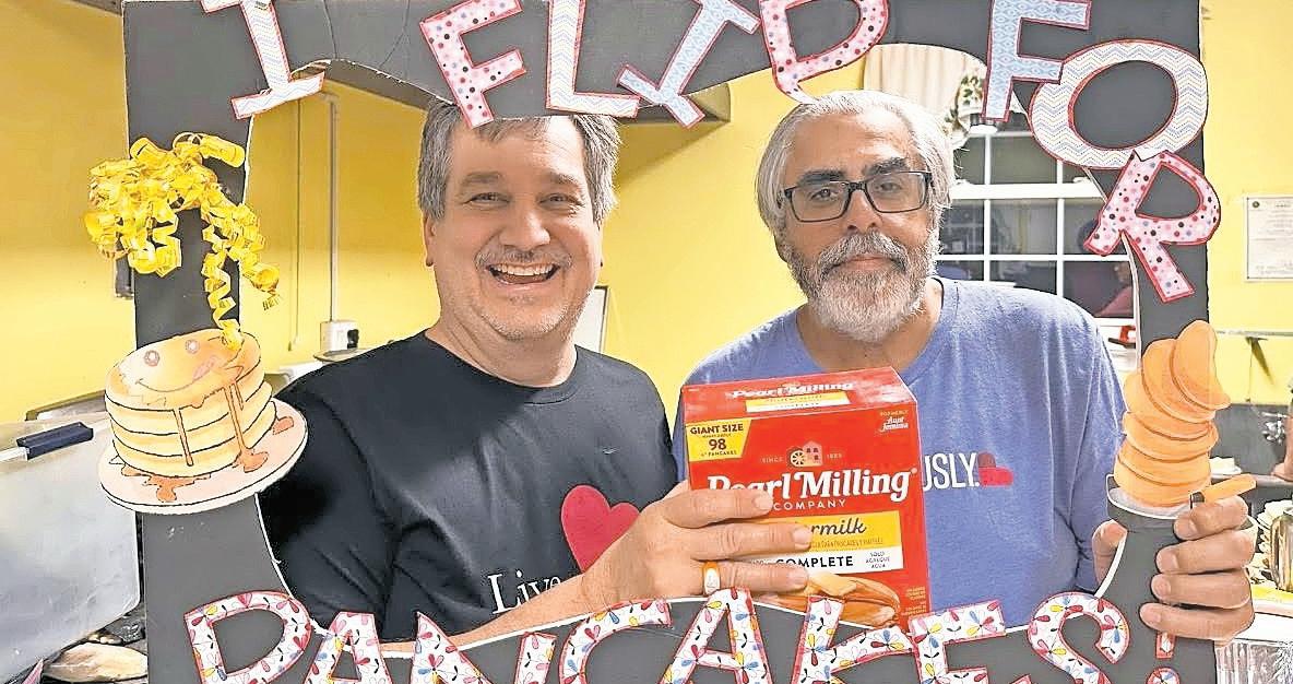 Church President Peter Cuccio, left, and Charlie Tapia mixed pancake ingredients during the celebration, a hands-on activity symbolizing fellowship and the shared blessings of the church community.
