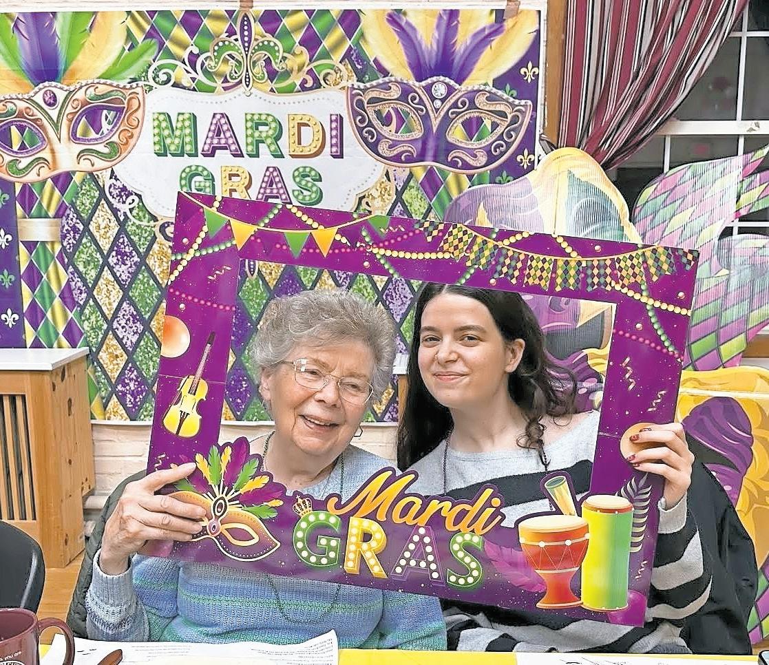 Lorraine Keller, left, and her granddaughter, Maggie Keller, participated in the Mardi Gras celebration at OLC, wearing colorful beads and taking part in a pancake-led parade.