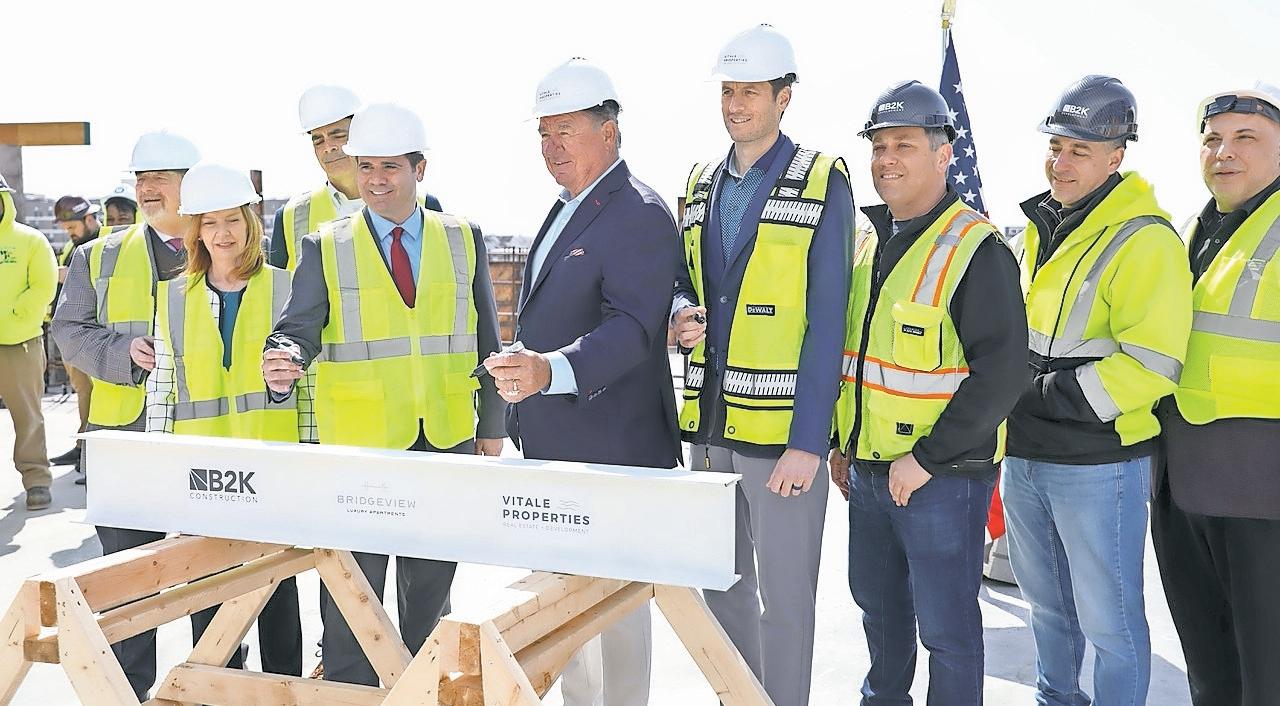 John Vitale, center, president of Vitale Properties, signed the ceremonial beam alongside project partners from Vitale Properties, B2K Construction teams and local officials during the topping-out celebration for The Bridgeview apartment development in Island Park on March 31.
