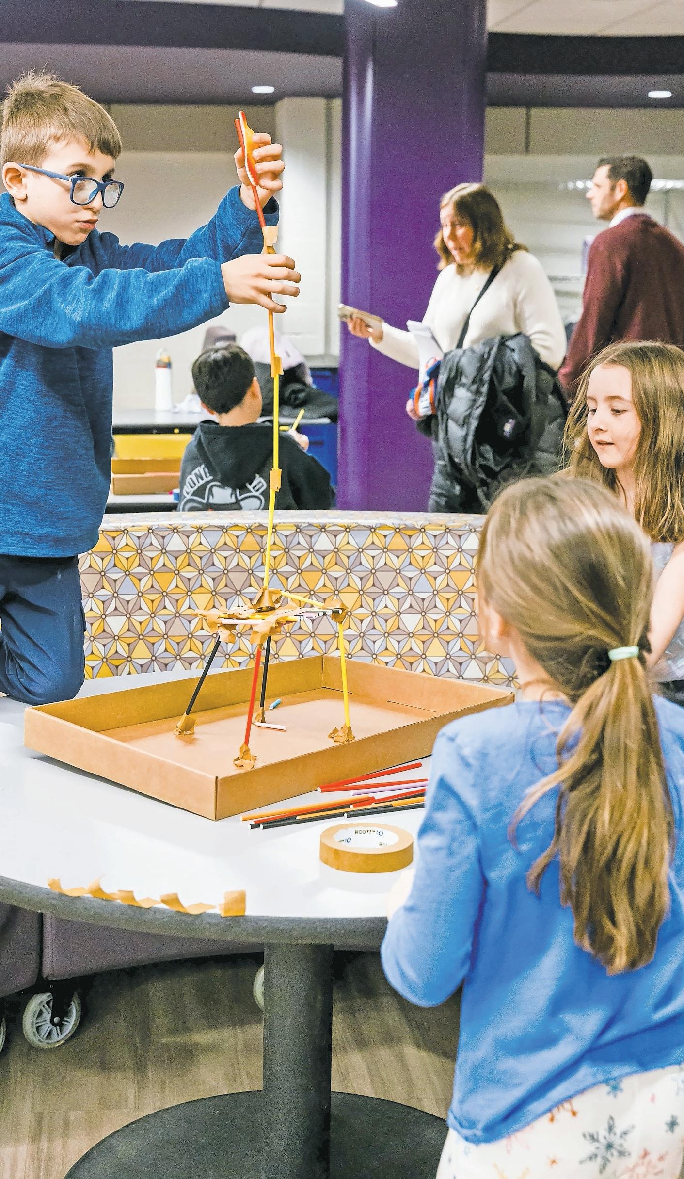 The cafeteria became an engineering laboratory where families competed in the Bird Perch Challenge, working together to construct the tallest possible structure using only straws.