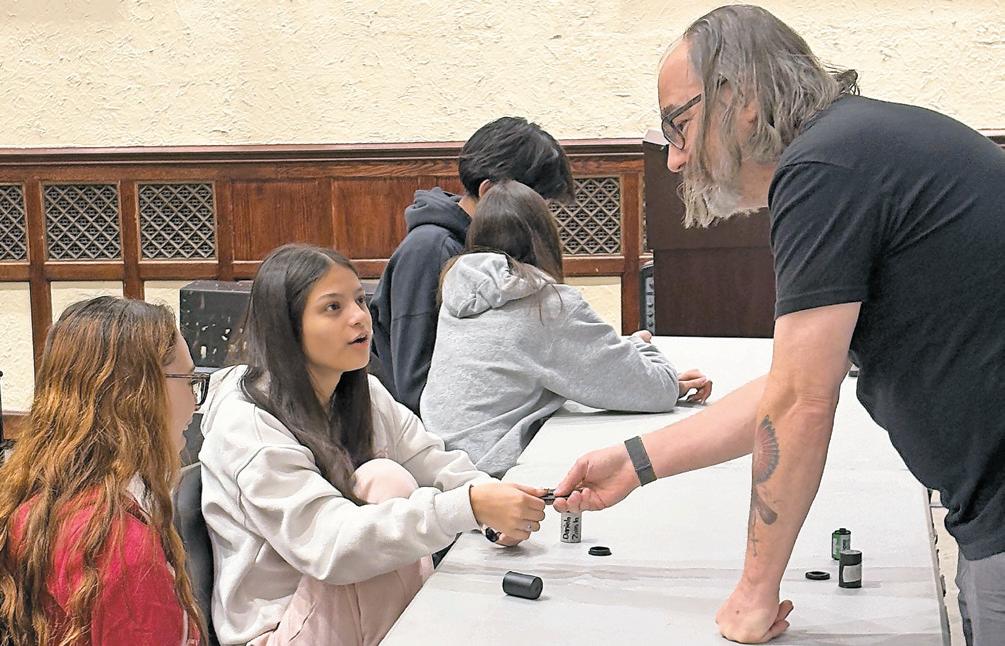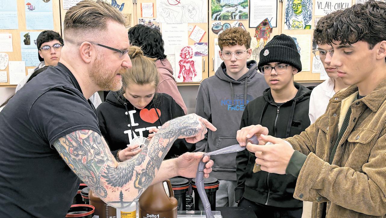 The second session on Feb. 13 transformed the school itself into a working darkroom. Students spent the day learning to extract and develop their own film, using blackout bags and an art room sink to mix chemicals and rinse their negatives before hanging them to dry on a line strung across the auditorium stage. Norton and an additional educator from Adorama, Seth Miranda, guided students through each step of the process, then reviewed the developed negatives with them. The negatives have since been sleeved and will be scanned so students can select and print their best work.