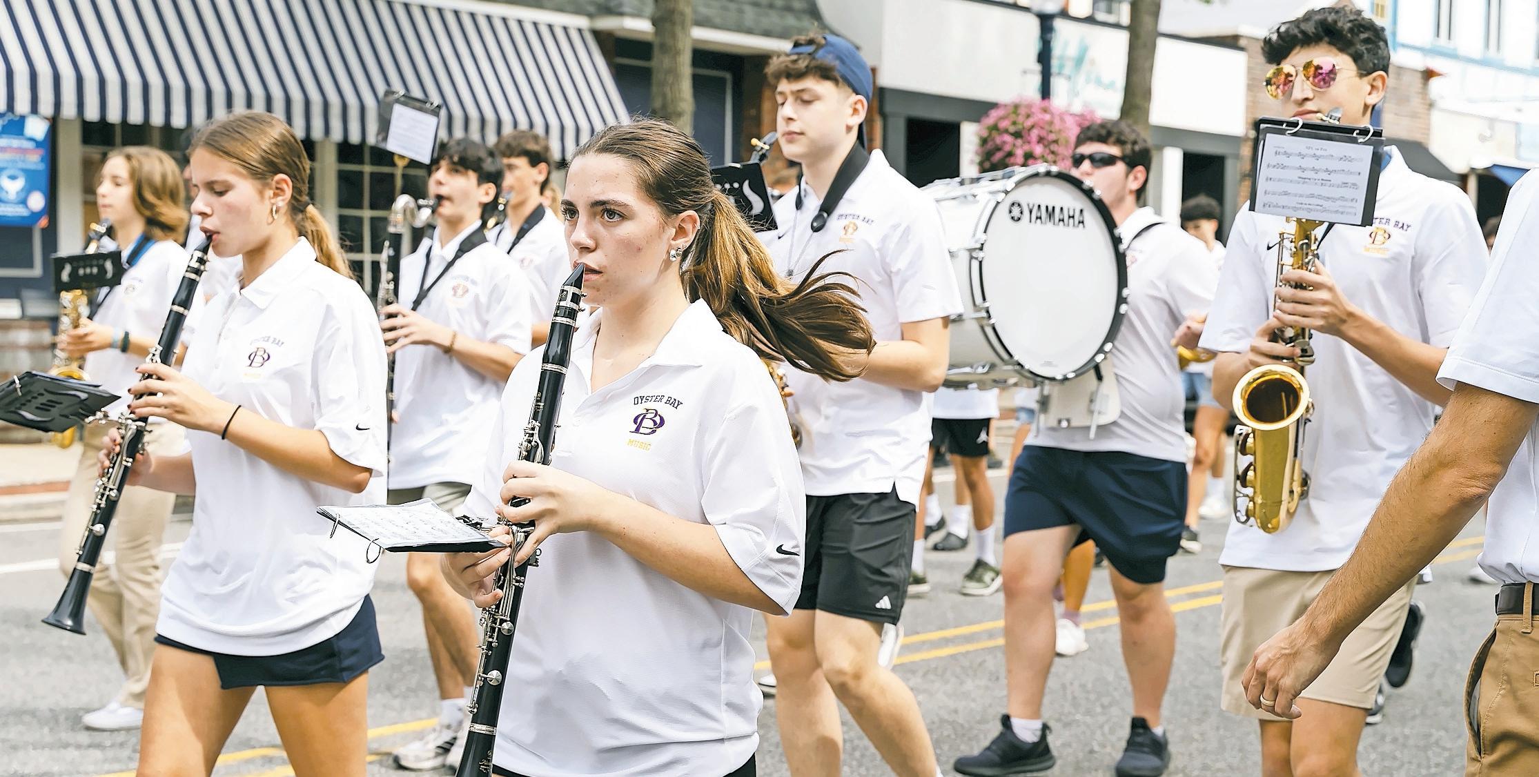 Members of OBHS’s marching band parade down Main Street from OBHS to Memorial Field.