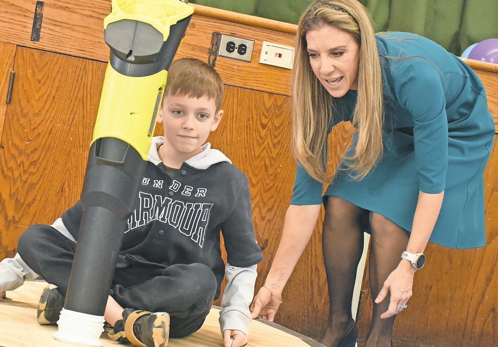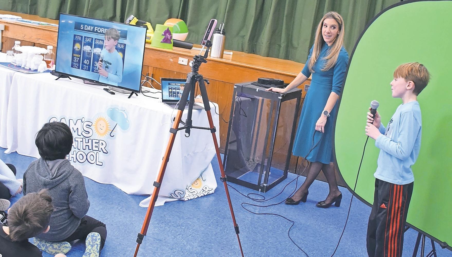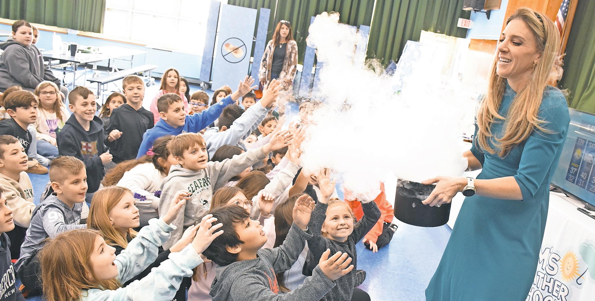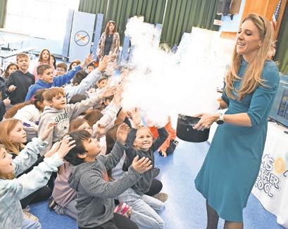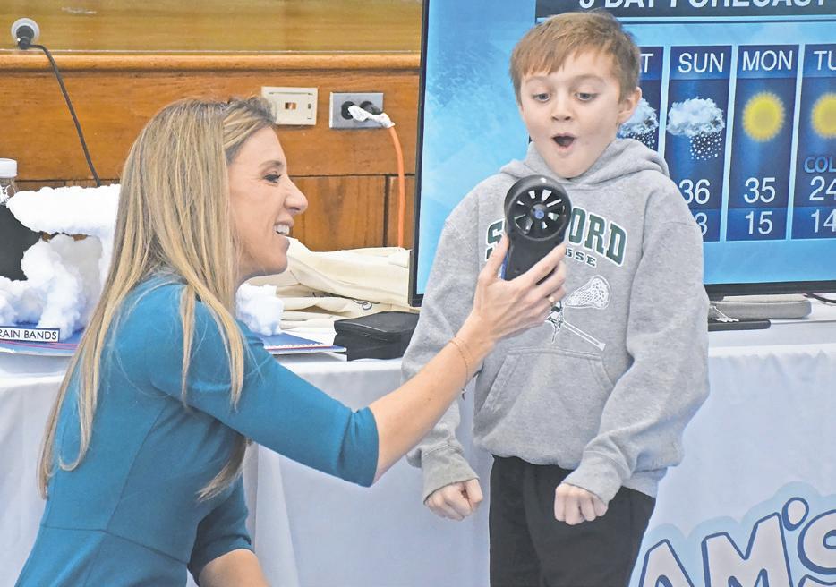 addition, students got to sit on a wooden board that hovered off the ground when attached to a leaf blower. At the end of her visit, the students became the meteorologists and stood in front of a green screen to give the fiveday forecast.