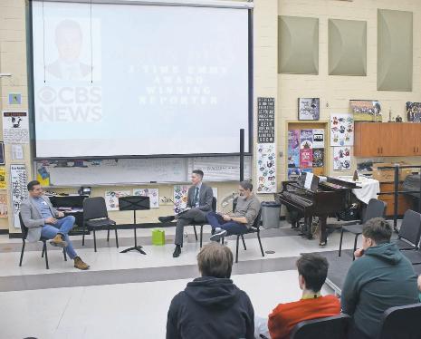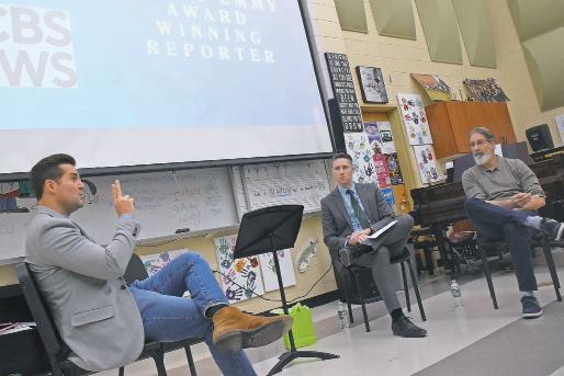 Dias, center, spoke about his journalism career. Coordinator of Fine and Applied Arts Patrick Kennedy, left, and Broadcasting teacher Curtis Tripoli during a visit to Seaford High School.