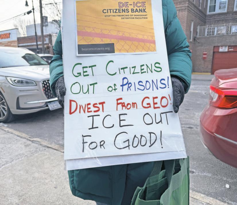Despite the frigid weather, residents gathered outside Citizen Bank to spread the word about the financial institution’s private prison funding.