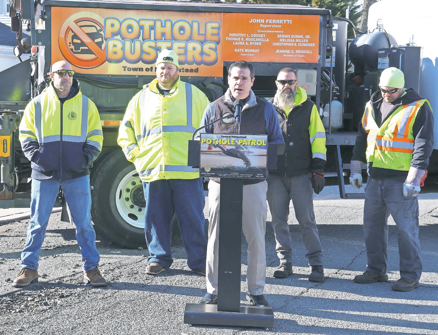 Town Supervisor John Ferretti announced the launch of the town’s Pothole Patrol during a news conference in Merrick, citing repeated freeze-thaw cycles and heavy traffic as the primary causes of pavement deterioration.