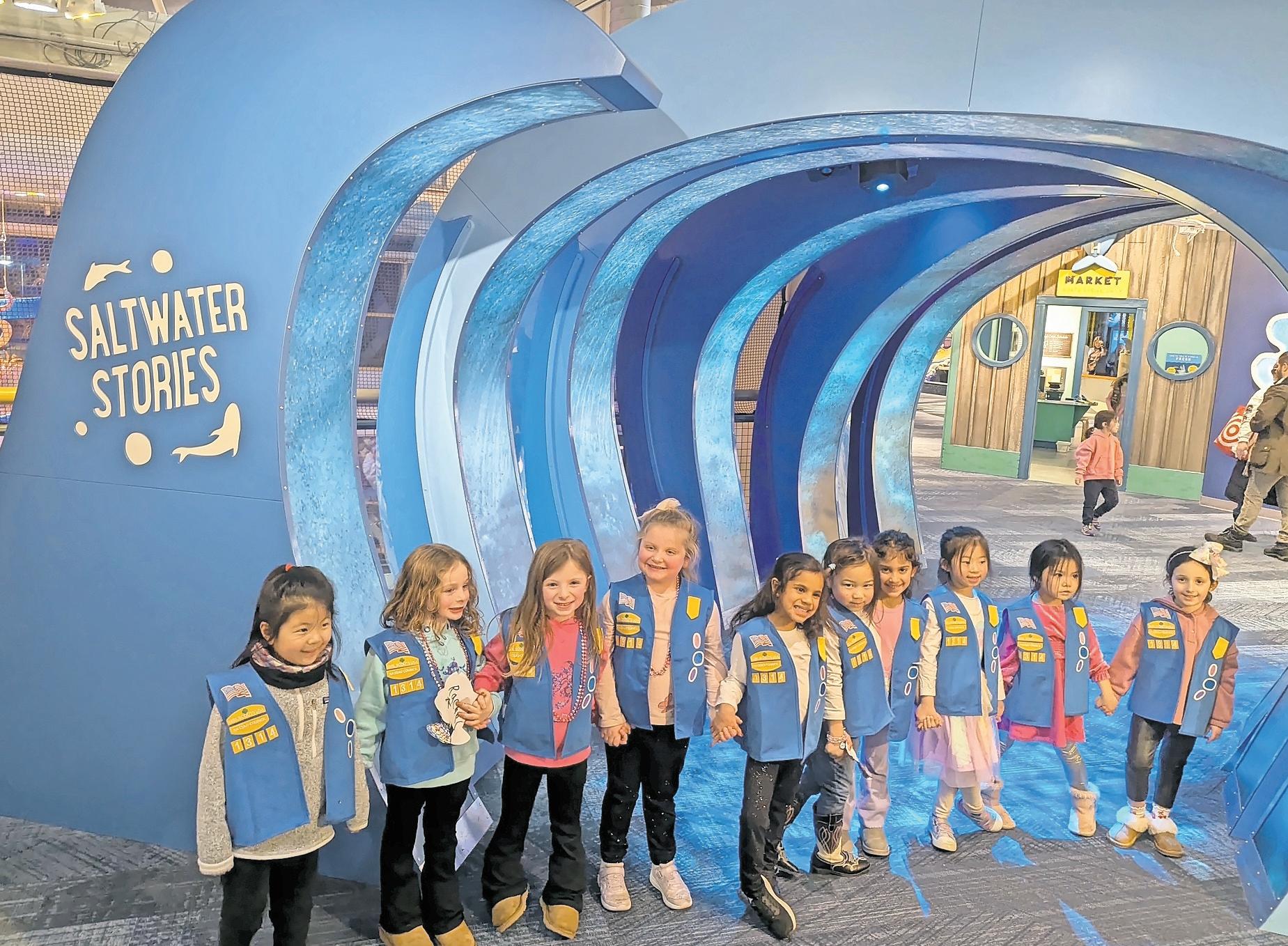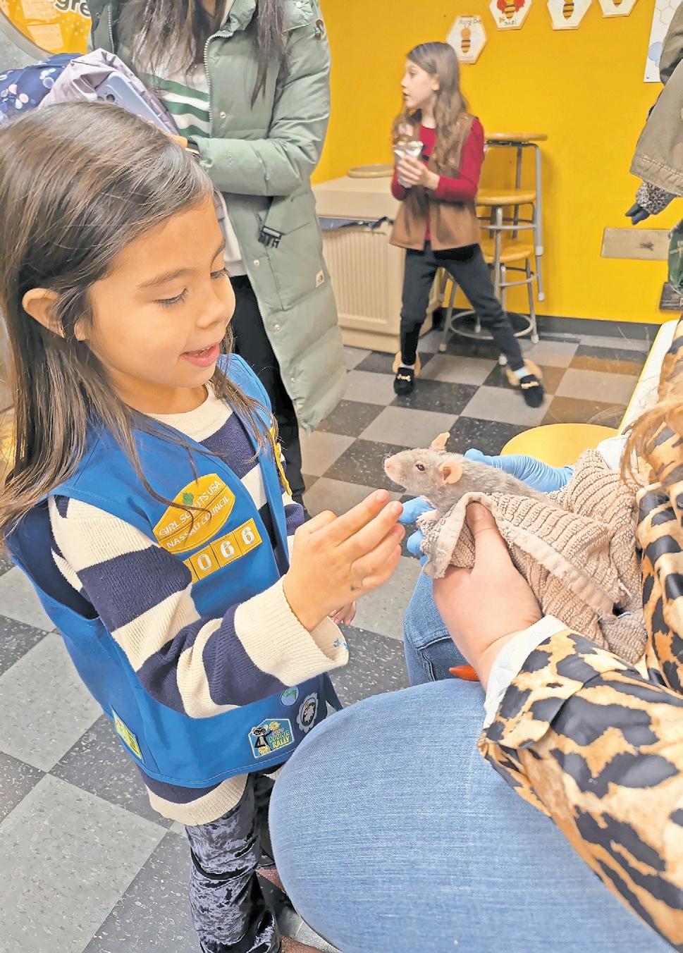 On Girl Scout STEAM Night last Saturday at the Long Island Children’s Museum, scouts rotated through four hands-on stations designed to spark their interest in science and exploration. At right, Daisy Eva Didonato, 5, got to know Brie, the “fancy rat,” at the Animal Adventure station, where a STEAM Night coordinator showed the girls a number of animals, including Mango, a bearded dragon; Mochi, a gecko; and Brie, and explained how evolution had shaped their bodies. Other activities included an exploration of motion, fluid dynamics and aerodynamics and the creation of a foil sailing vessel. Above, the scouts toured the museum’s permanent exhibit, “Saltwater Stories.”