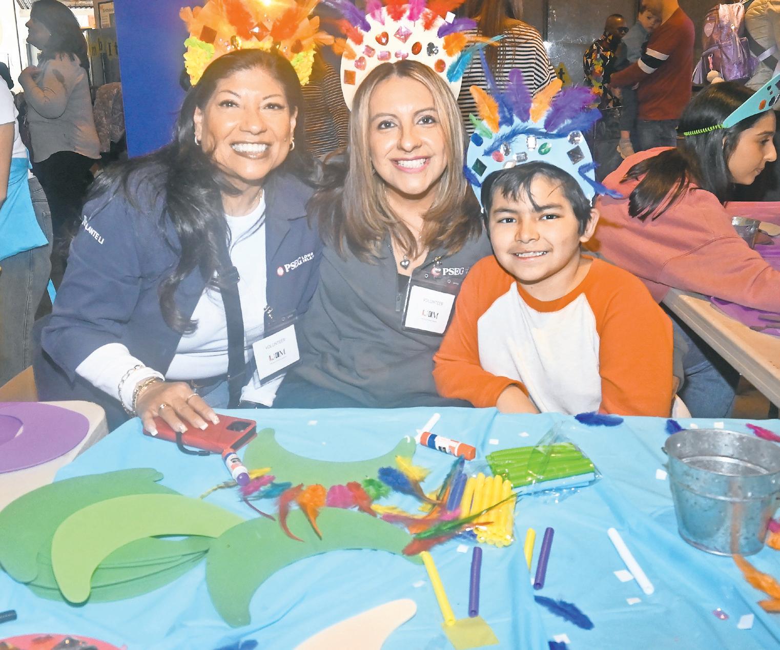 PSEG Long Island volunteers Theresa Delacruz, left, Mariela Espinosa and Leonardo Macias, 9, show off the festive hats they created to wear throughout the Carnival