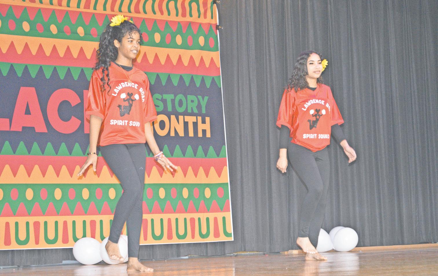 Abranna Florentino and Crital Martin of the Lawrence Road Spirit Squad, who were few of the students to perform for the Black History Month Assembly.