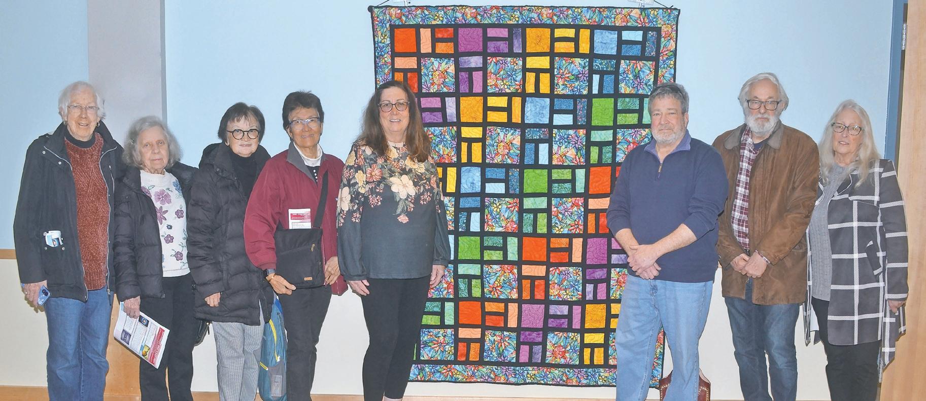 Patti Schust, to the immediate left of the display quilt, opened her art show at th