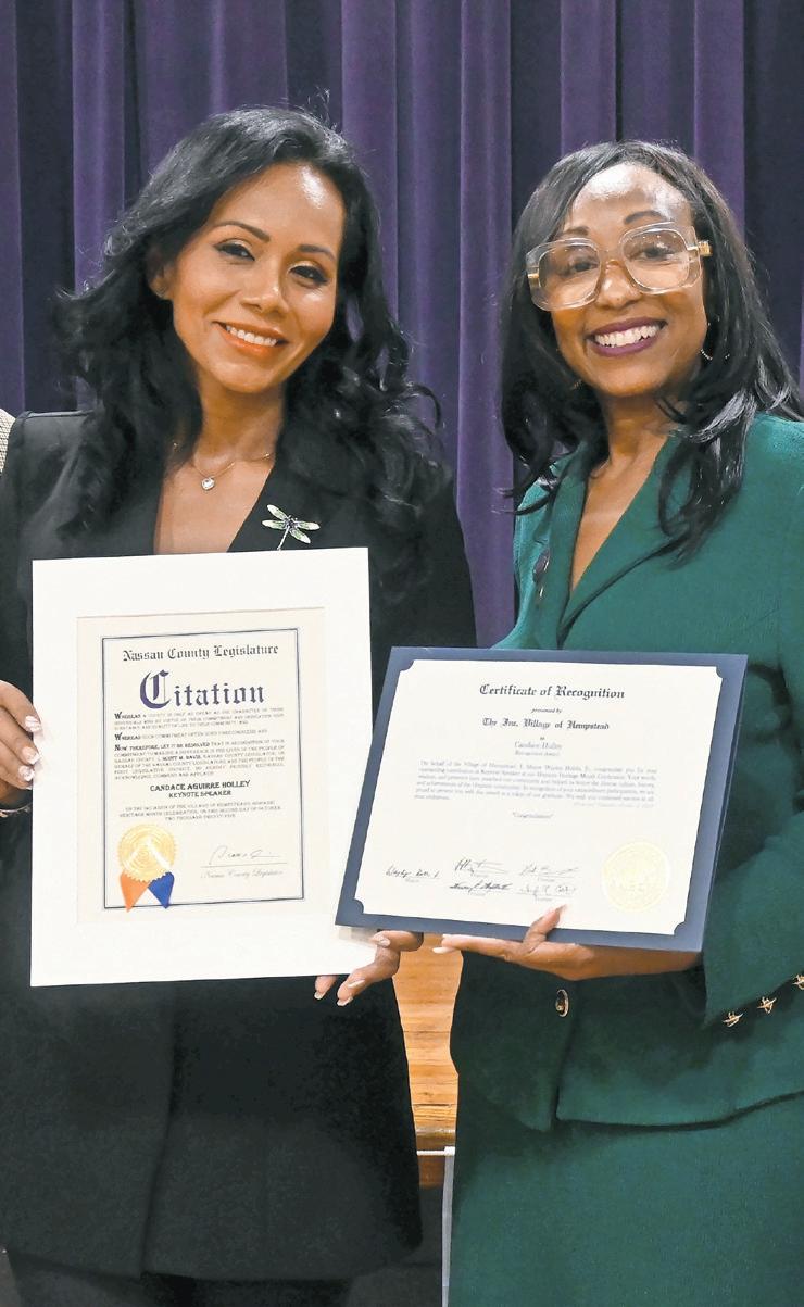 Candace Holley receives certificate of recognition by the Village of Hempstead Mayor Waylyn Hobbs Jr. Hempstead Village, presented by village trustee Tanya Carter. Holley also receive a Nassau County Legislative citation for her commitment to make a difference in the lives of the people in Nassau County.
