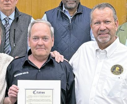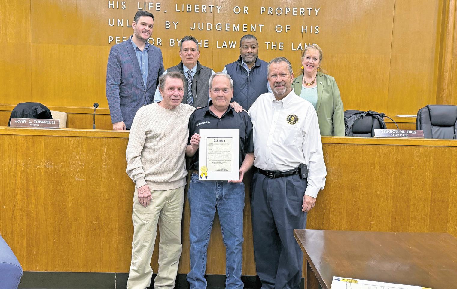 Mayor Ed Fare and the board presented a village citation to Kevin Bennett for his actions during a medical emergency on Jan. 10 at a parish dance held at Holy Name of Mary Church. Bennett, a former Meadowmere Park Fire Department captain and firehouse chaplain, responded when attendee Bobby Flynn collapsed and became unresponsive.