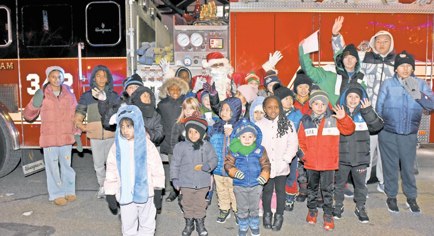 Families and excited children crowded around Santa by the fire truck, soaking in the magic of the annual holiday block party.