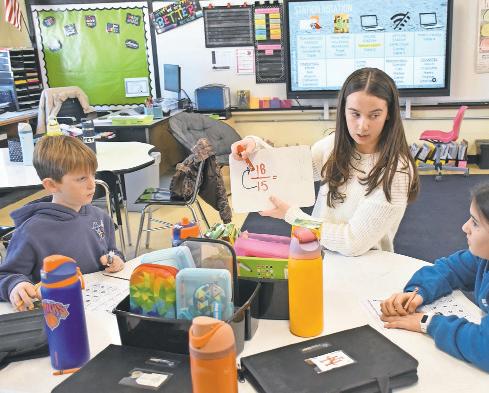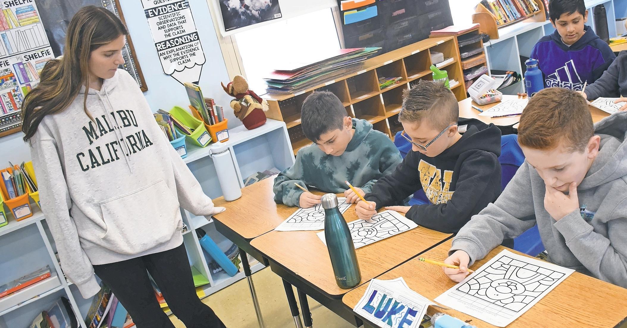 Other participants included sophomore Dylan DiScala, who assisted in Amanda Mooney’s fifth-grade math class, and Sophia Santopietro, who worked with third graders. “I’m enjoying that I get to see teaching from a different perspective,” Santopietro said.