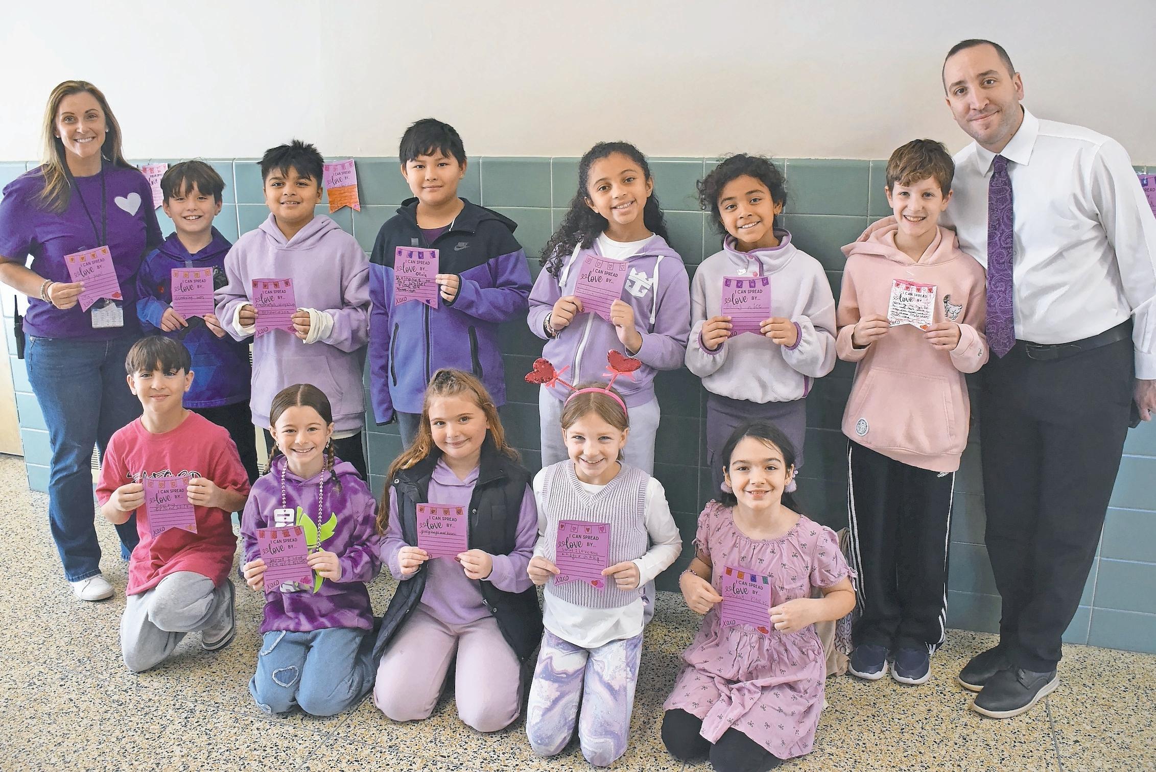 On P.S. I Love You Day, Feb. 13, Seaford Manor Elementary School students showed off their notes listing acts of kindness, joined by social worker Jennifer DiMieri, far left, and Assistant Principal Rich Schwartz.