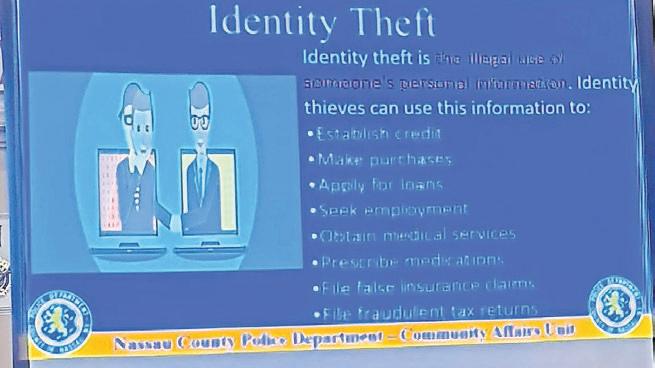 EEugene Messmer, an officer with the Nassau County Police Department’s Community Affairs Office, led the crime prevention meeting. He spoke about common scams targeting residents of Nassau County, and the importance of being aware of con games and how to keep their private information safe and secure.