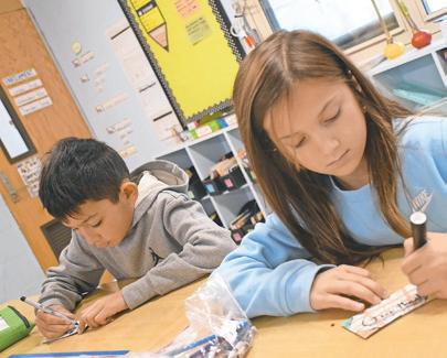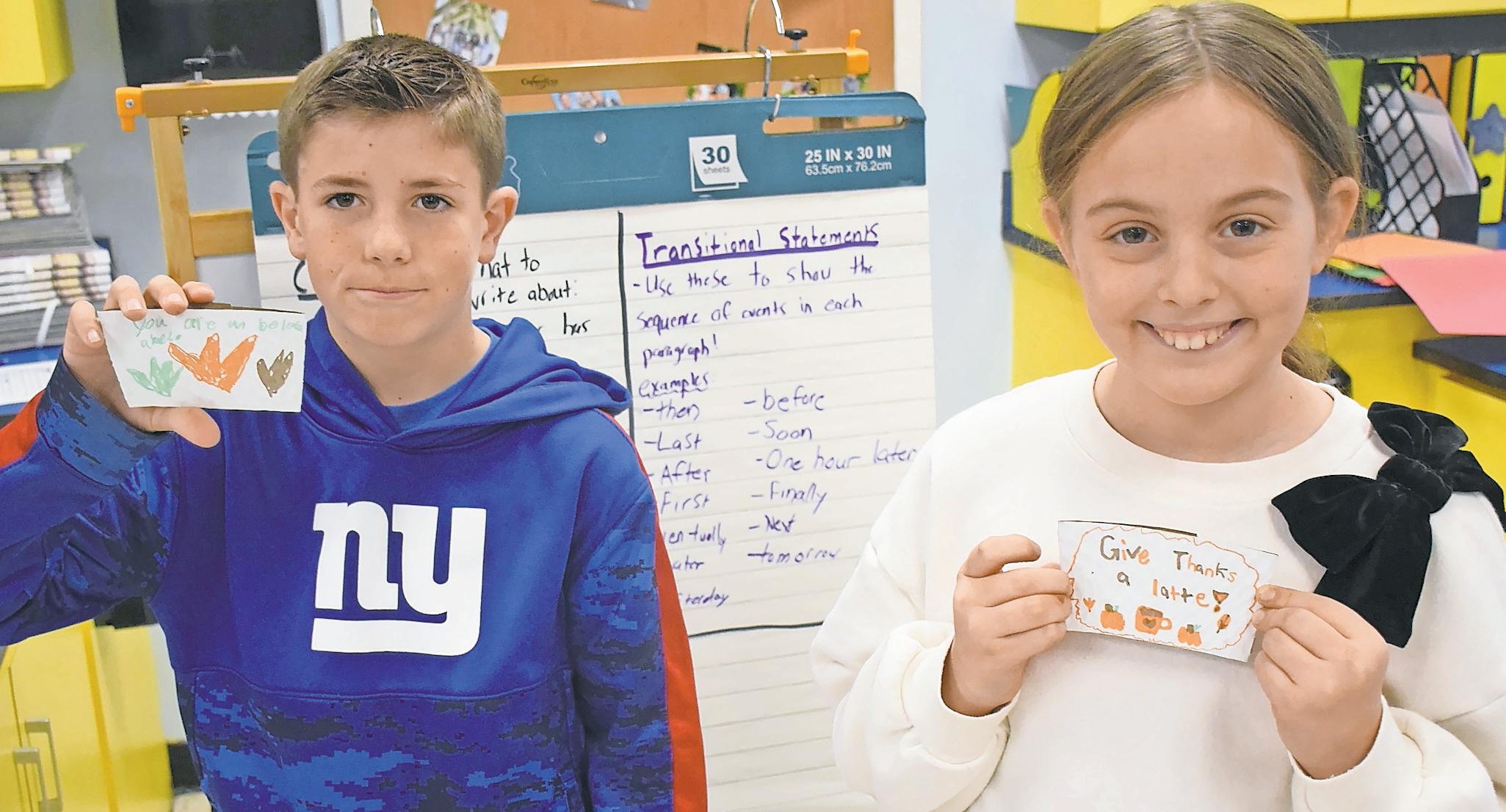 Fourth graders Austin McCann and Adrianna Barra display their gratitudethemed coffee sleeves, designed to bring a smile to someone’s