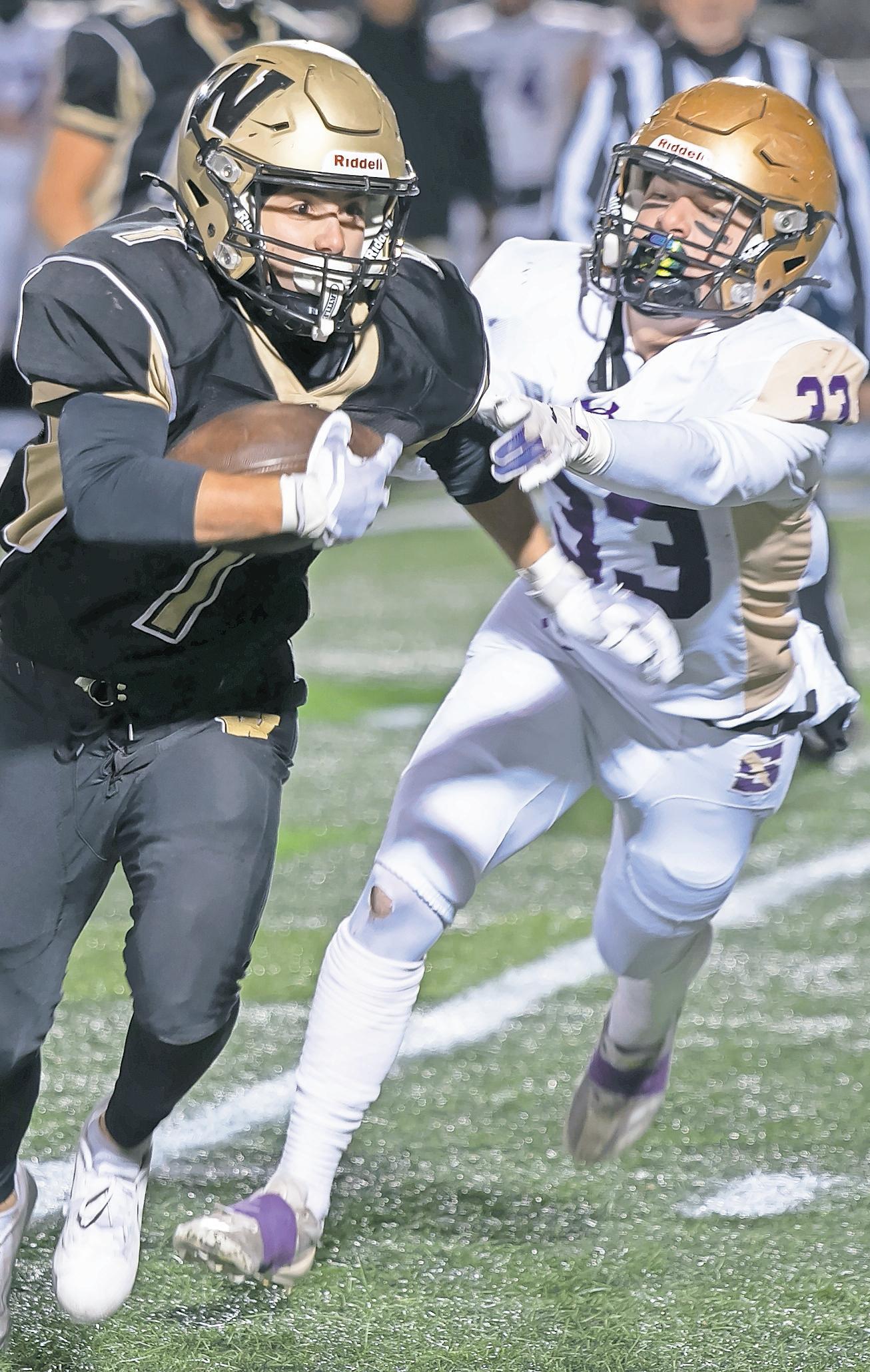 The Warriors (8-4) were led by their fantastic four: seniors Joe Nicholson, Devin Paccione and quarterback Carter Loughman, and sophomore Luke Martini. Loughman fired touchdown passes to each of the other three and passes for 278 yards. Nicholson and Martini added rushing touchdowns as well. Paccione had 121 receiving yards and two interceptions. Martini had 11 tackles.