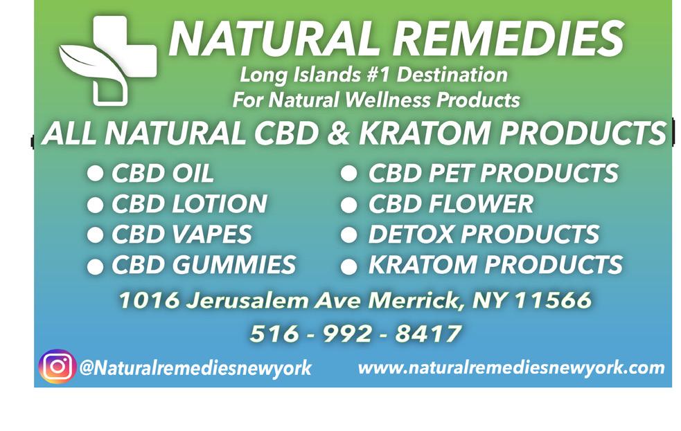 To Advertise call 516-569-4000: 1204666 Merchant and Publisher are not responsible for misprints. Coupons not combinable. Expiration: 5/31/23 Coupons not combinable. Expiration: 5/31/23 20% OFF EntirE PurchasE FrEE cBD tEa Bag or cBD PrE rOll JOint CBD/HEMP DERIVED THC NOW AVAILABLE WINNER “LONG ISLAND’S FIRST CBD DISPENSARY” #1 DESTINATION FOR NATURAL WELLNESS PRODUCTS NATURAL REMEDIES MERRICK 1016 Jerusalem avenue • merrick, nY 11566 (516) 992-8417 • naturalremediesnewYork.com