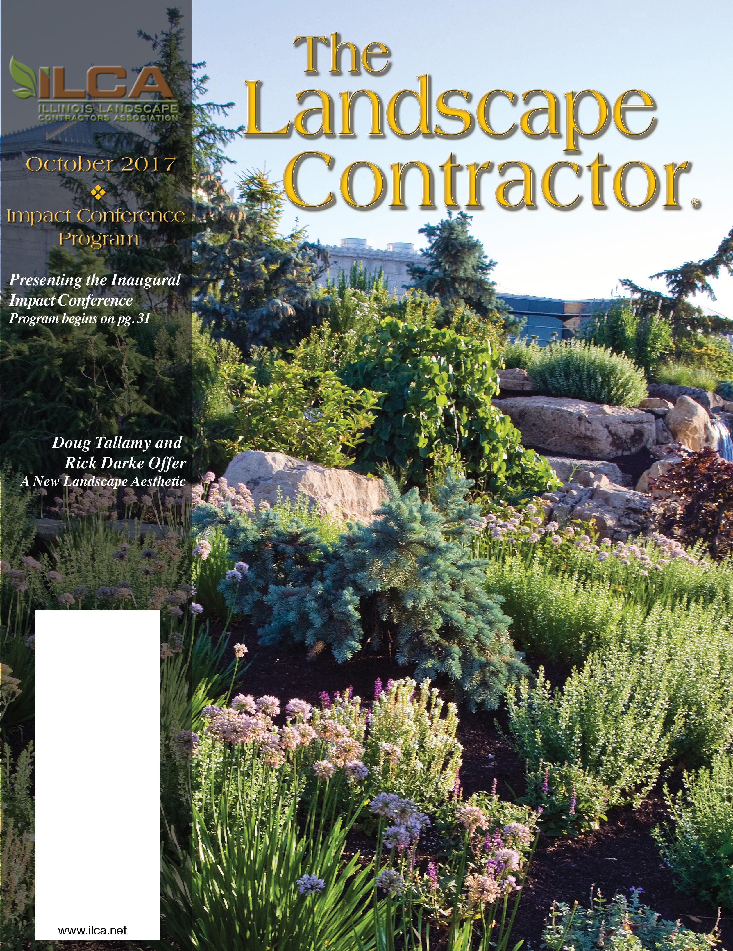 Volume 58, Number 10. The Landscape Contractor (ISSN # 0194-7257, USPS # 476-490) is published monthly for $75.00 per year by the Illinois Landscape Contractors Association, 2625 Butterfield Road, Ste. 104S, Oak Brook, IL 60523. Periodicals postage paid at Oak Brook, IL and additional mailing offices. Printed in USA.