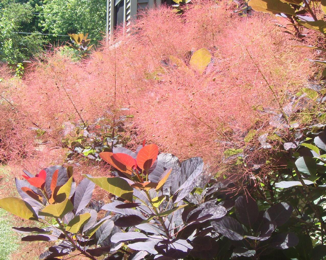 Purple-leaved elderberries offer a full sun alternative to Japanese maples with their lacy fine-cut foliage. You get all the delicate texture with a wet-tolerant, fastgrowing, deep wine-purple color. These elderberries bloom pink in large flat clustered flowers. They usually do not bear fruit, so they can be planted along walks and patios with little fear of messiness. Elderberry is a vigorous grower that may need cutting back every few years to keep it in check. Try it with coarse tall perennials like Rudbeckia maxima, Gateway Joe Pye weed, and queen of the prairie for a dynamic combination that will likely hide the neighbors.