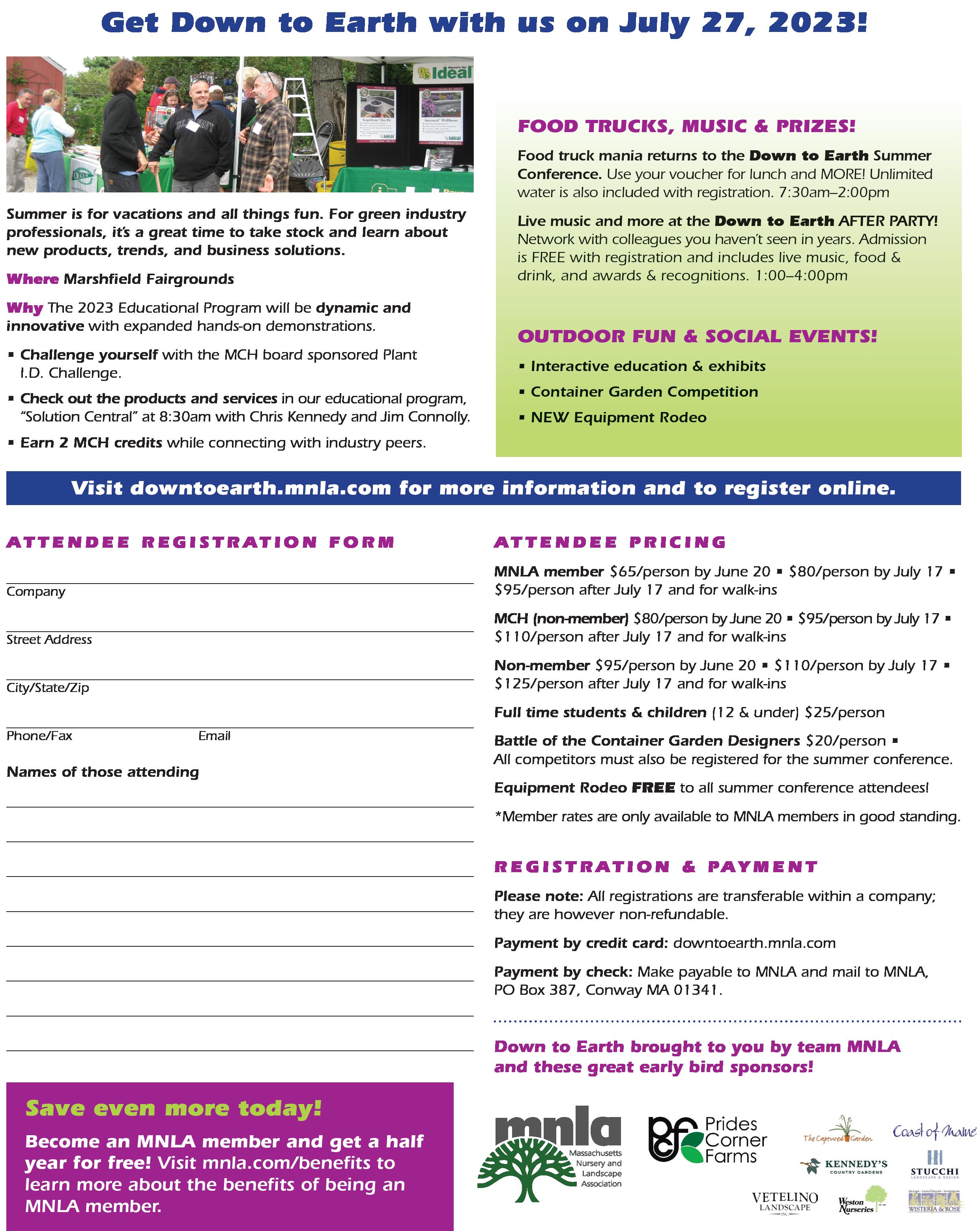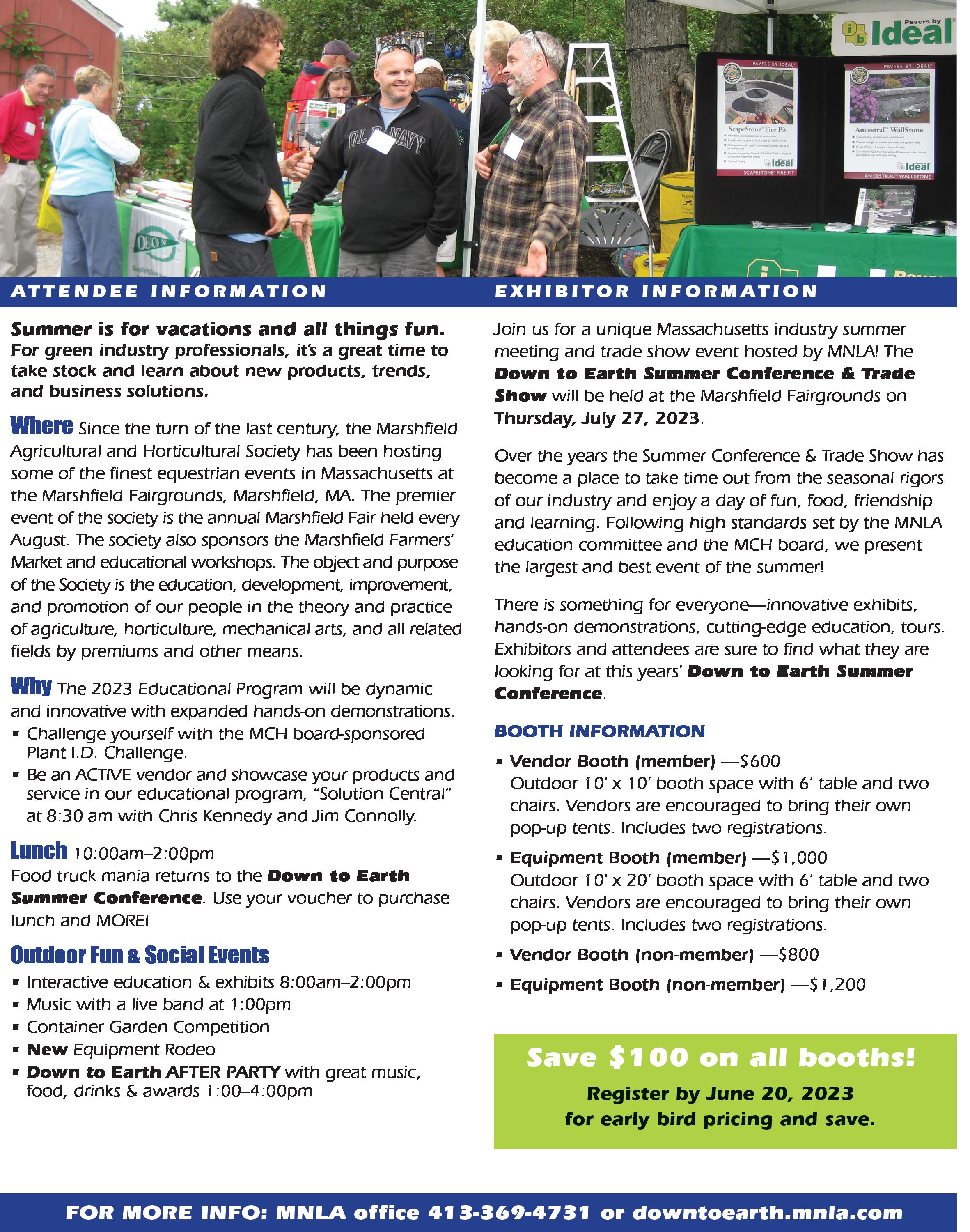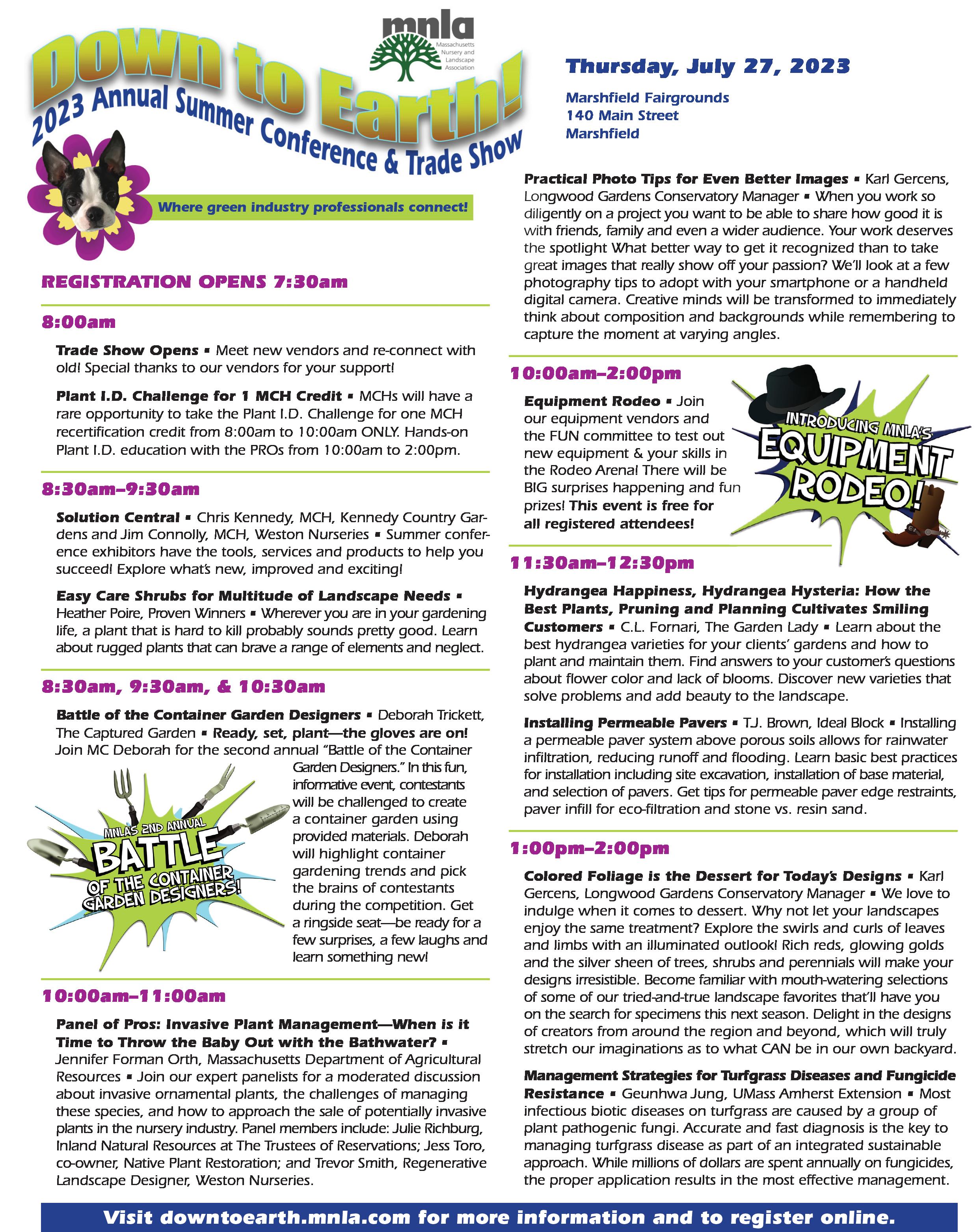 MNLA’s 2023 Down to Earth Summer Conference and Trade Show will be held on July 27th at the Marshfield Massachusetts Fairgrounds. This mid-summer event provides education, exposure to new products and services, networking, and entertainment (more on all that in a moment) thanks again to the diligent work of staff and member volunteers.