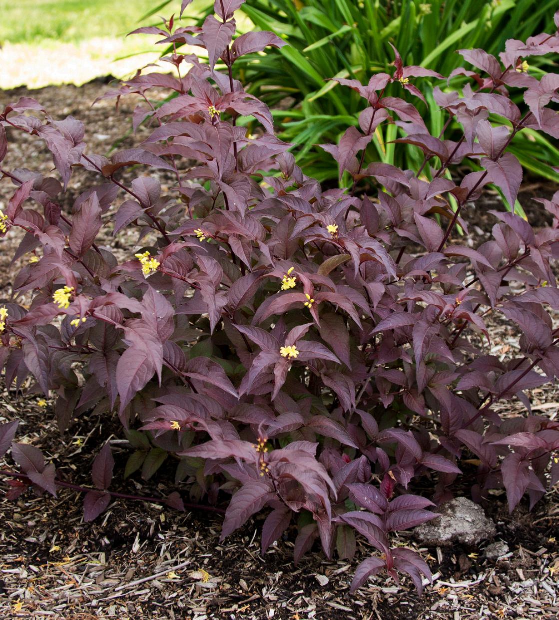 For full sun to full shade, Diervilla or bush honeysuckle is a tough, hardy, adaptable shrub that blooms in sulfur yellow clusters in heat of summer. Look for Kodiak® Black for a 3 to 4-foot selection or Firefly™ Nightglow™ for slightly smaller at 2 to 3-feet. These are soft, rounded shrubs whose foliage is most intense in spring before turning deep red in fall. They can be a terrific alternative to burning bush in the shade garden. Pollinators flock to the yellow flowers in July and August. Underplant these with short sedges or weave them through variegated Solomon’s seal with mid-sized ferns for a beautiful, layered effect.