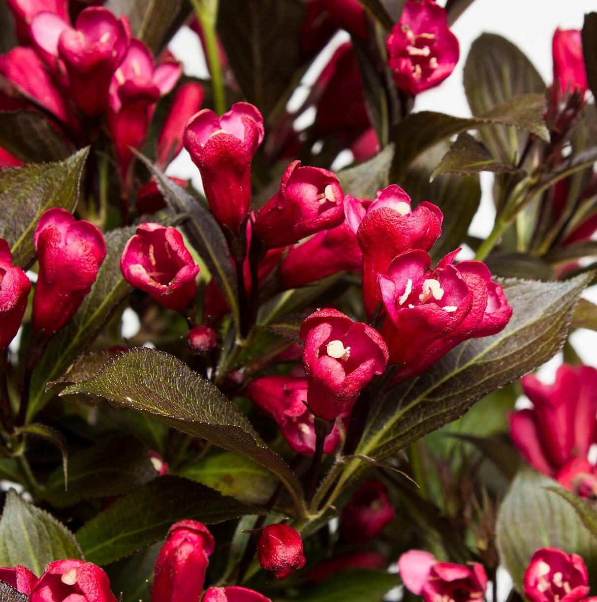 flowers in May. The shiny, plasticky texture of weigela leaves can almost shimmer in the purple cultivars. They also take shearing well, making them an interesting boxwood alternative for small hedges. Check out Electric Love™ and Midnight Wine Shine® for a tiny one to two-foot varieties perfect to weave into perennial borders. There are 3 to 4-foot cultivars that make outstanding foundation plants including the classic Wine & Roses. Weigela’s tubular flowers are attractive to butterflies and hummingbirds, making them at home in a pollinator garden. Try them with late blooming bulbs and springflowering perennials. They can provide beautiful contrast with dianthus, coral bells, and geums.