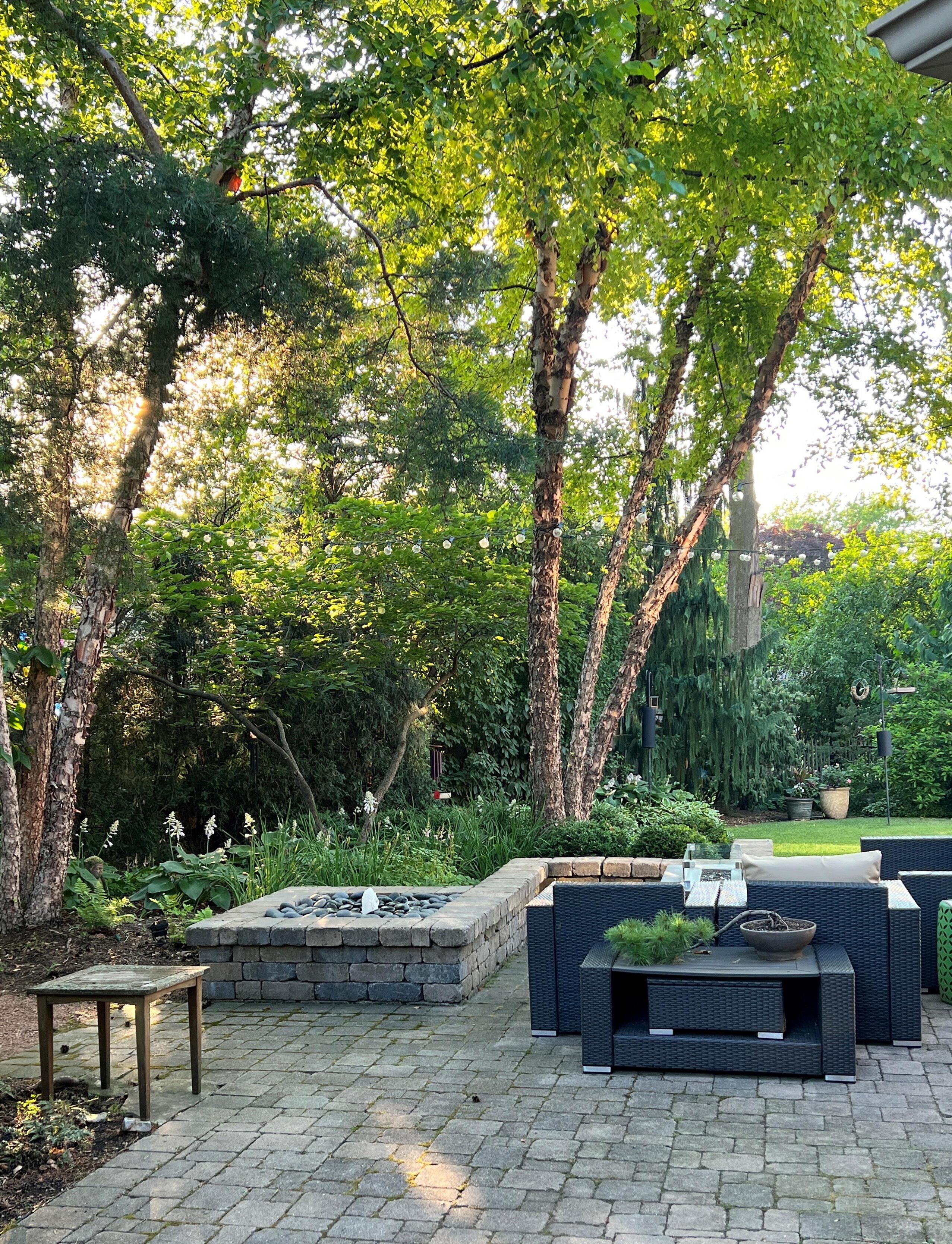 Can lights within the structure and low voltage lighting throughout the outdoor space provide added functionality and ambiance. The outdoor season is extended with the addition of heaters mounted to the structure’s ceiling, along with the incorporation of a natural gas fire pit. Planting beds framing both sides of the patio provide seasonal color throughout the year.