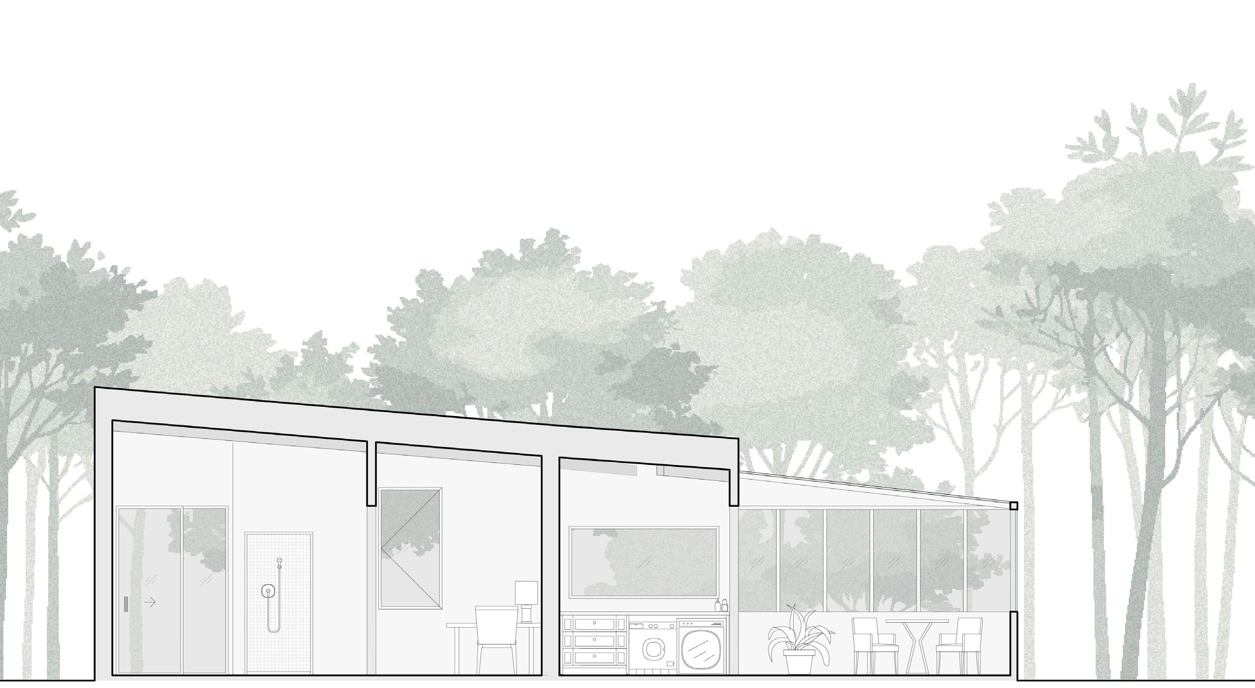 The house negotiates its relationship with the landscape through a sequence of adjustable edges. A pivoting wall allows the room to shift between enclosure and openness, dissolving the boundary between interior life and the surrounding context.