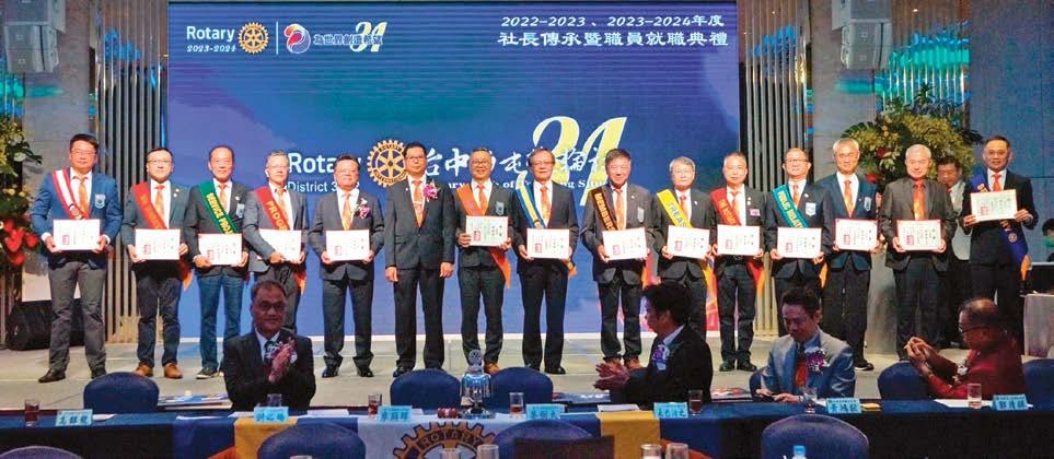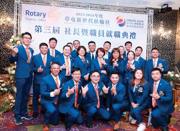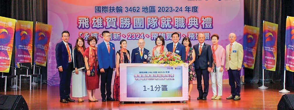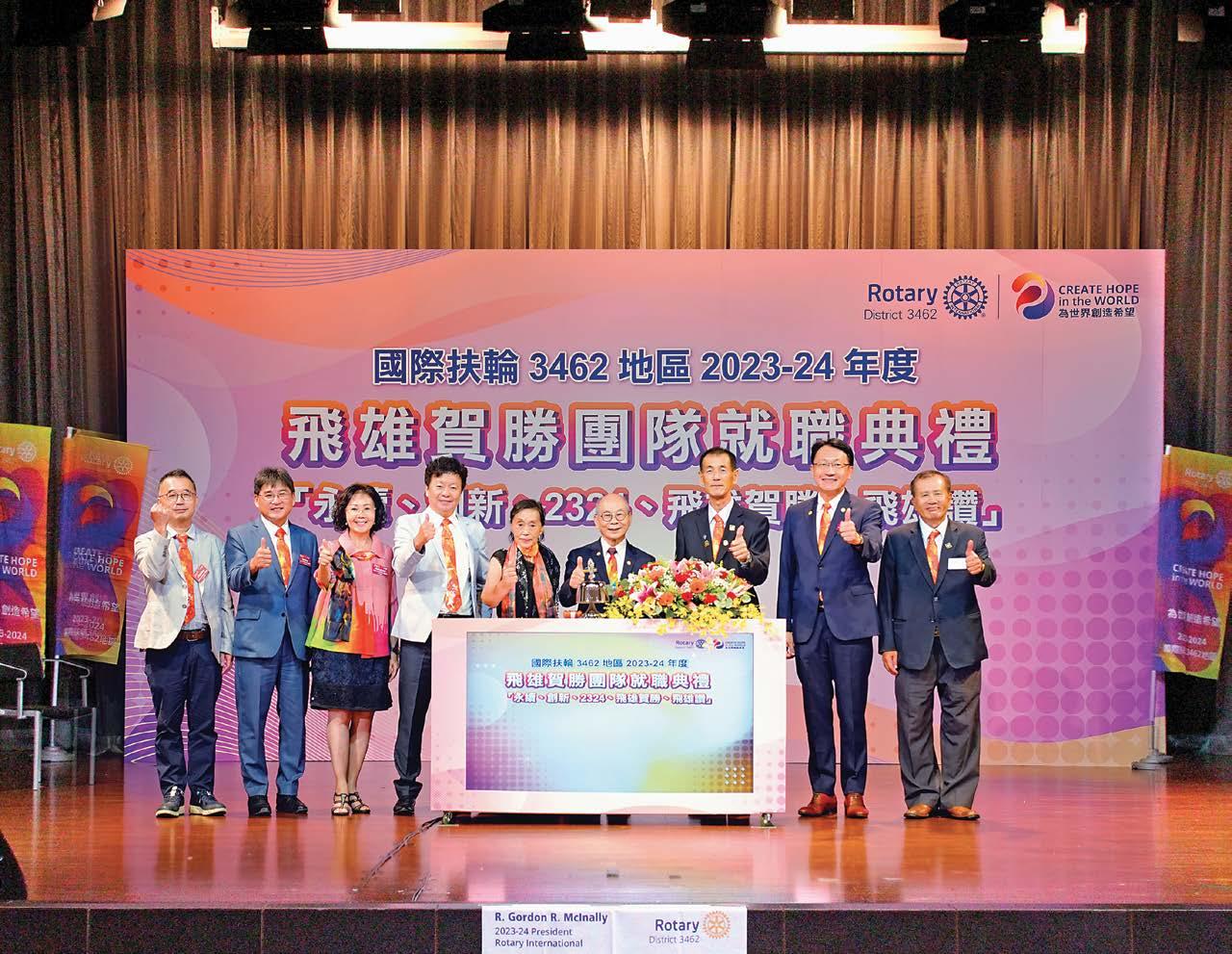 籌備已久的國際扶輪3462地區202324年度地區總監團隊暨各社長聯合就職典禮於 7月1日上午在大葉大學演藝廳舉行,由我與 64位新任扶輪社長一起鳴鐘就職,正式宣告 2023-24新年度的團隊啟航。團隊以「永續創 新、飛雄賀勝、飛雄讚」為口號,藉此聯合就 職典禮展現我們團隊的服務熱情,全力實現地 區年度目標,與RI一起為「為世界創造希望 Create Hope in the World」而努力。