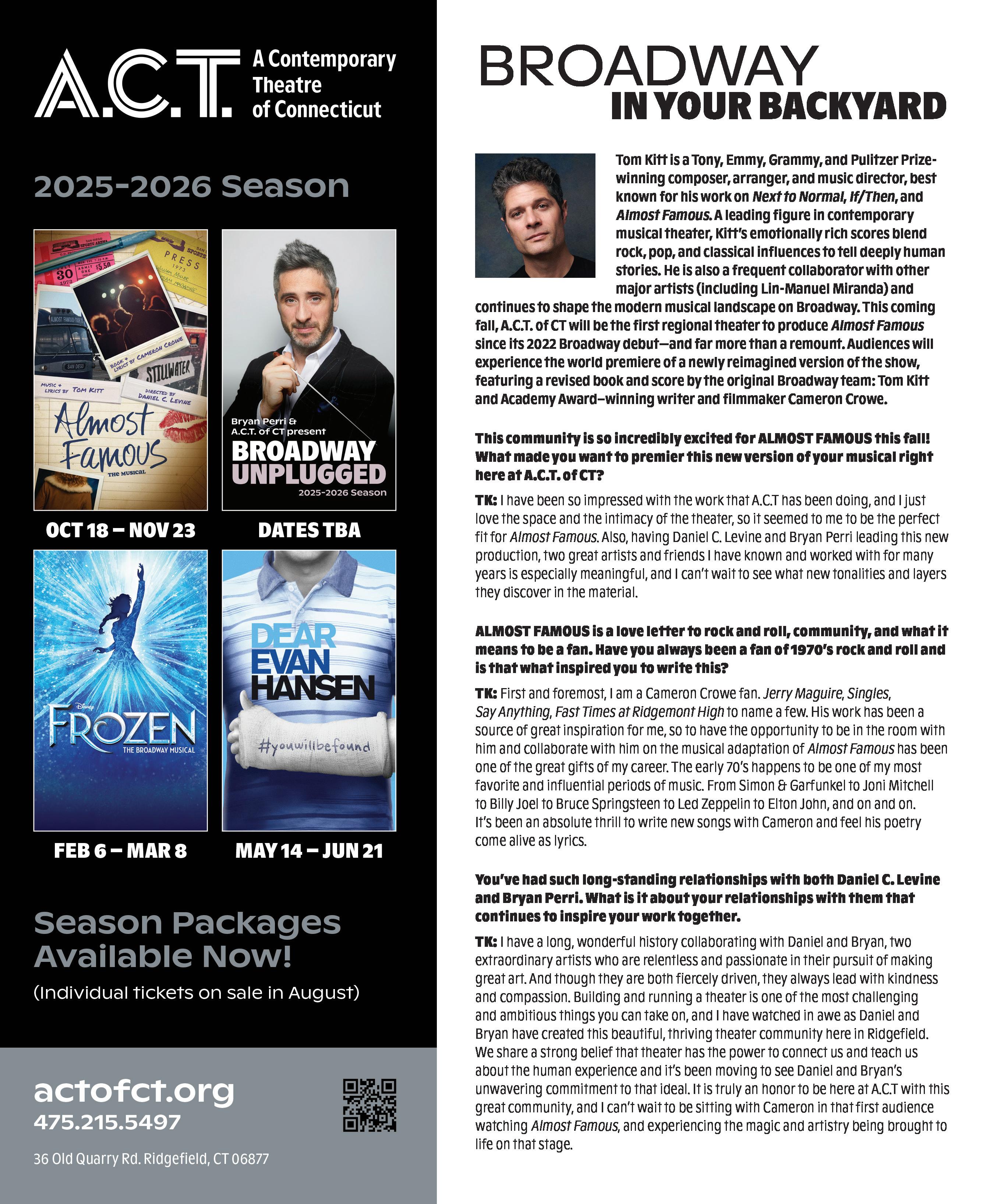 version created specifically for A.C.T. Both Crowe and Kitt are working closely with Daniel C. Levine to shape this new chapter of the show’s journey. “I am deeply honored and humbled to be collaborating so closely with Tom Kitt and Cameron Crowe on this extraordinary project,” says Levine. “The fact that they are entrusting our theater with the next evolution of their deeply personal and iconic musical is thrilling—and a milestone for A.C.T. of CT.” With a new structure, fresh material, and immersive staging, this Almost Famous will be unlike anything audiences have seen before.