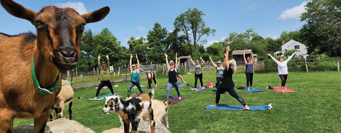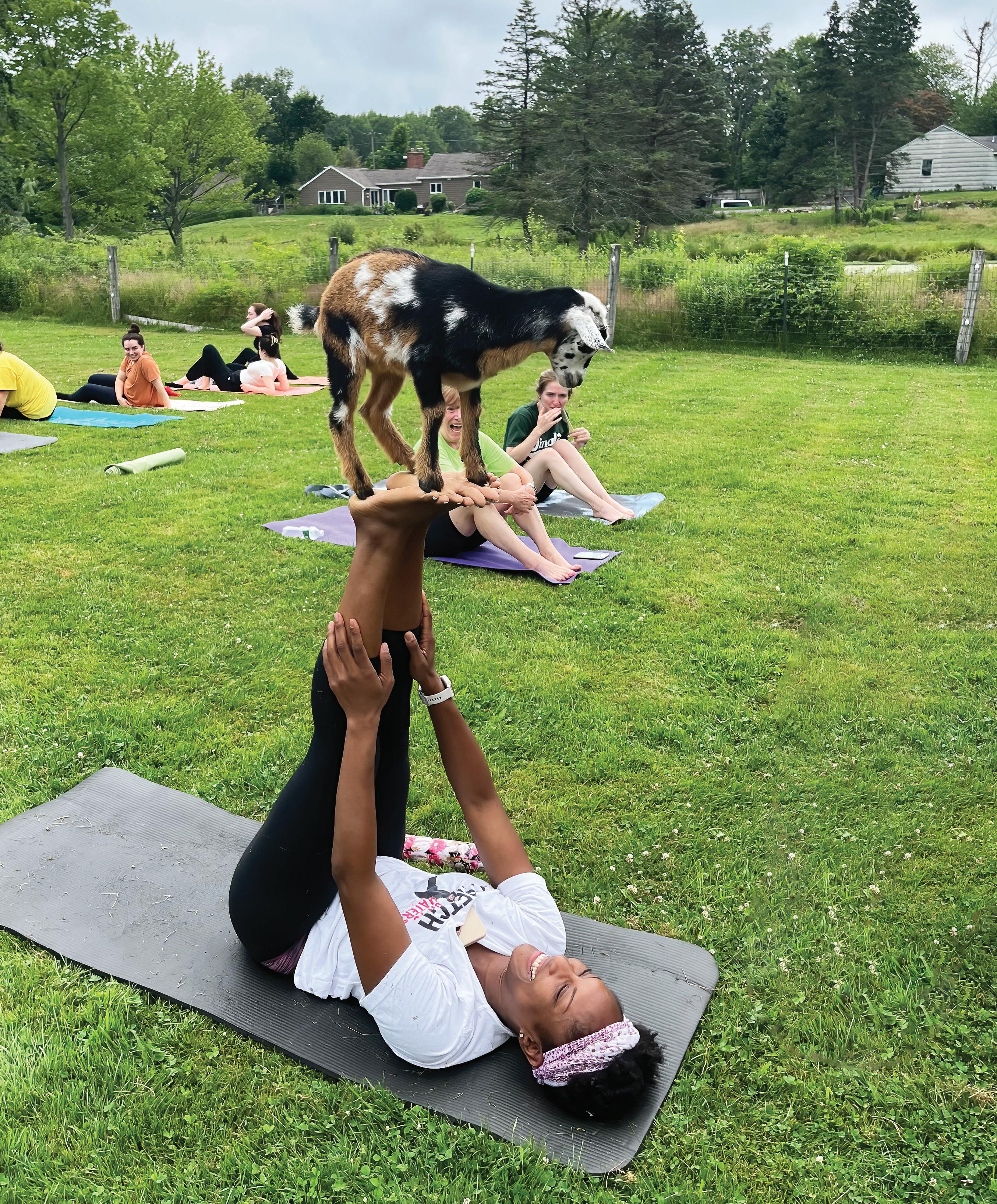“It is definitely geared toward beginners, fun, and connection,” says Bradley Mountain Farm owner Anneliese Dadras. “It’s less about the poses and more about the silliness, laughter, and joy from being with the animals.”