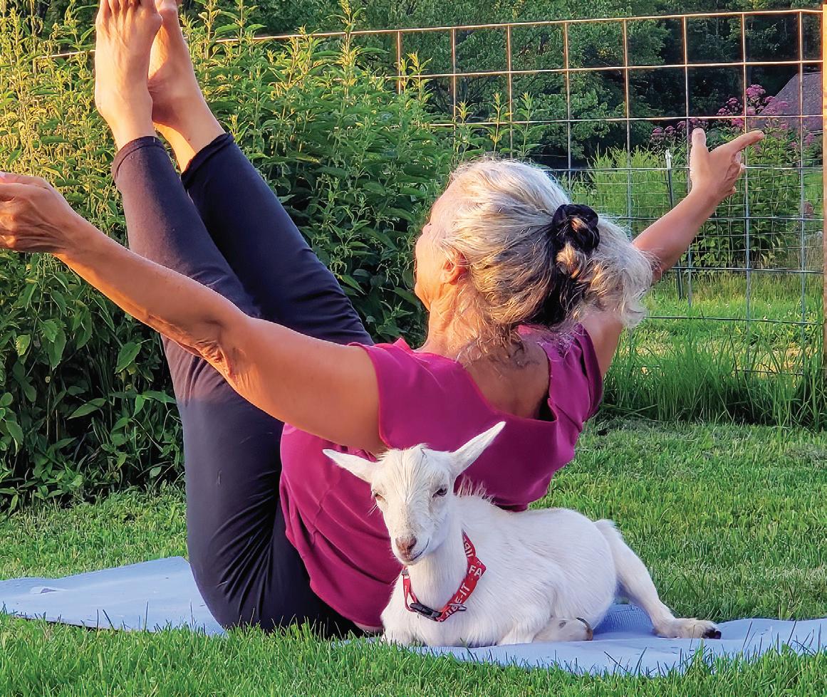 What if I’m not flexible? “No one is watching you,” Karleen assures, “Everyone is paying attention to the goats, and you can participate in any level - even simply lying on your mat.” An easygoing attitude is all the flexibility you need.