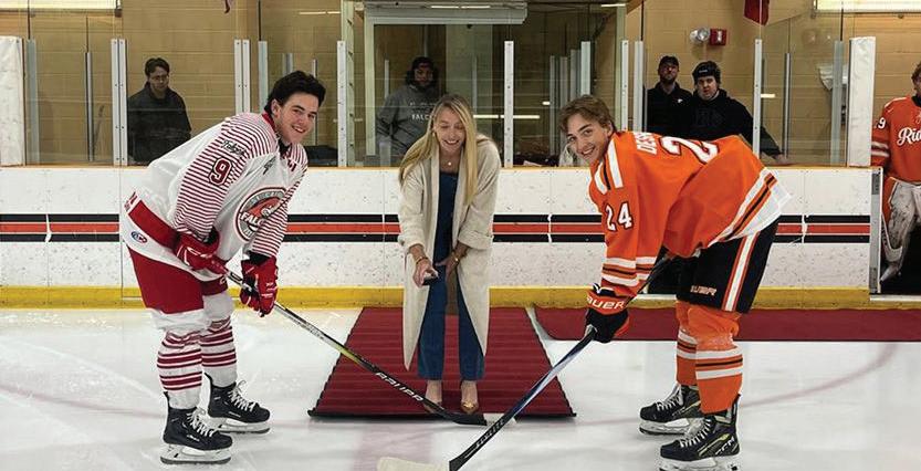 Ridley College Board Chair and STEP President/Founder Suzanne Court ’86 dropped the puck alongside former Ridley captain Sam Lockyer ’23 (left) and Bennett Desroches ’26 (right).