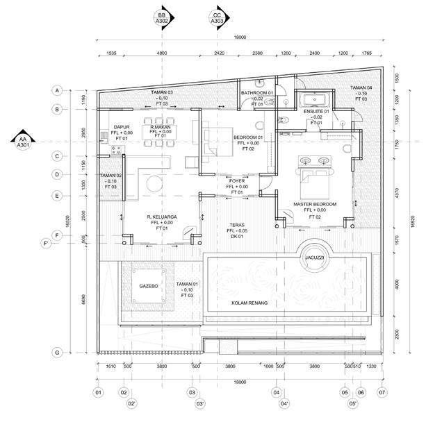 Lahan bertipe Row ini dimaksimalkan dengan compact sehingga fungsi-fungsi kamar dapat dipenuhi sebanyak 4 kamar, dan terdapat ruang multifungsi untuk mendukung hobi orang tua untuk melukis.