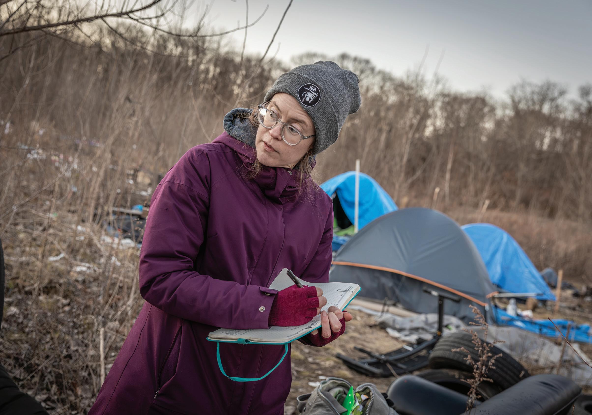 Dr. Karb, at right, and Megan Smith make one of their regular visits to a tent encampment. On any given day, they check in with a half-dozen or more residents.