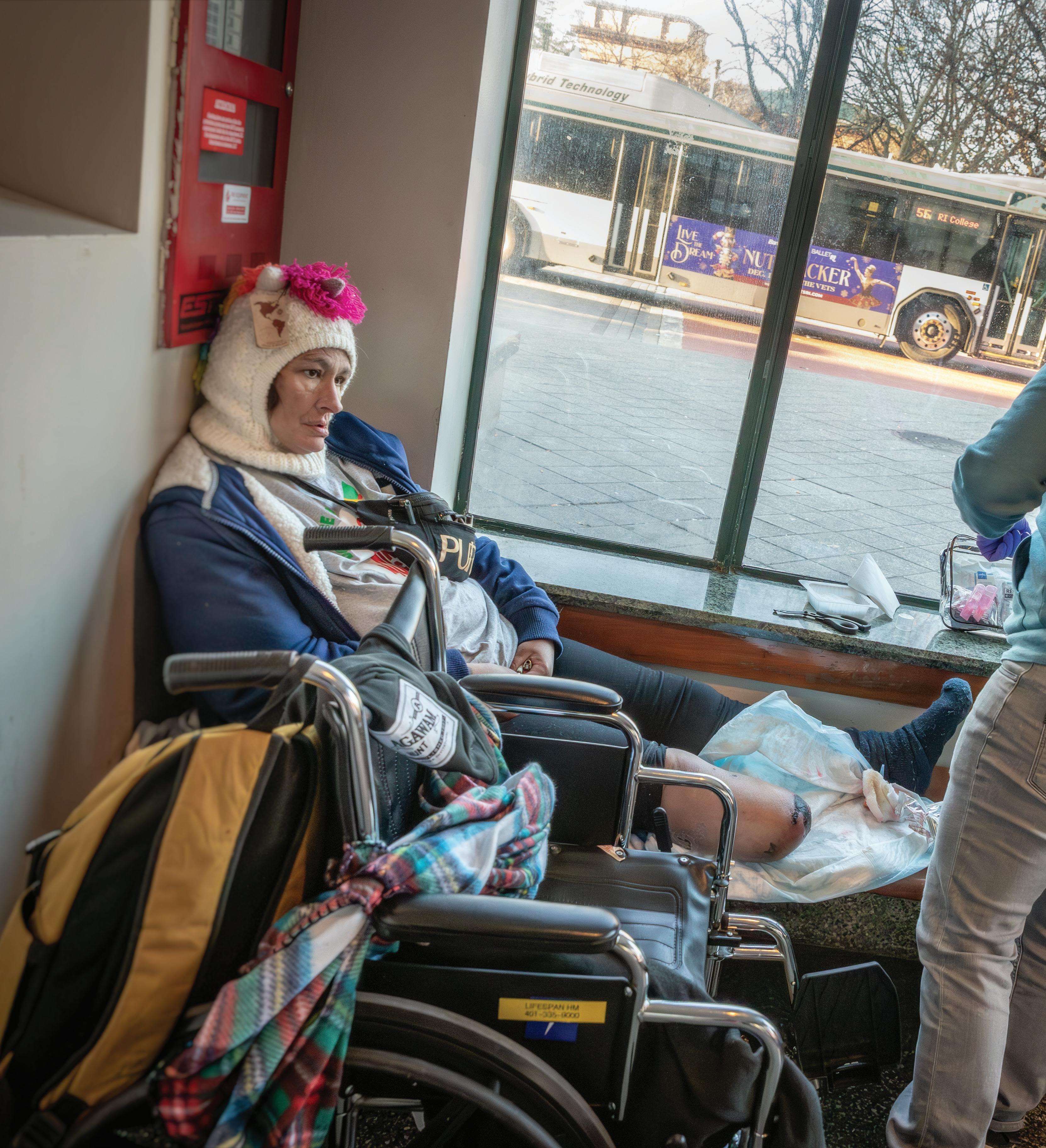 At Kennedy Plaza, Dr. Rebecca Karb (in blue sweatshirt), an emergency medicine doctor, and Megan Smith, PhD, an assistant Professor in the School of Social Work at Rhode Island College, treat N., who has an infection following a recent amputation.