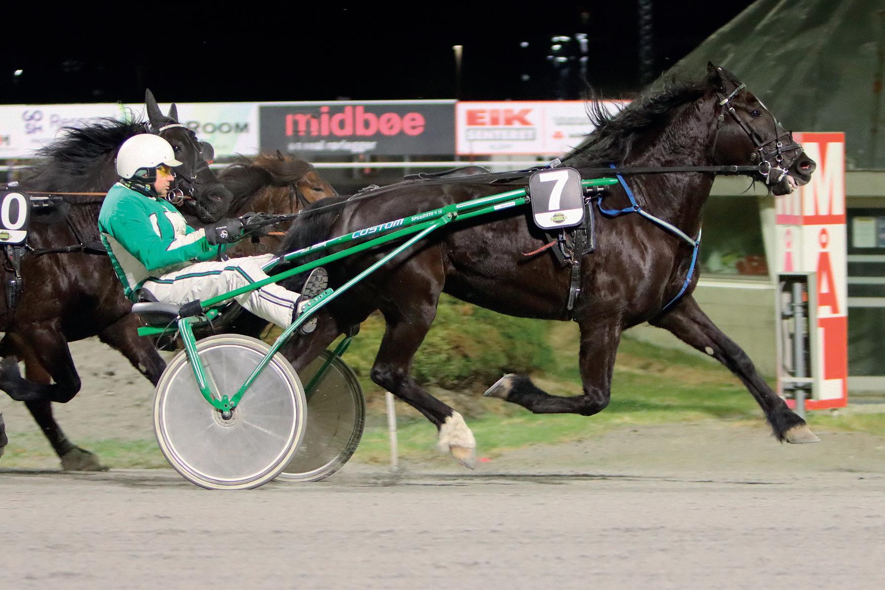 3 år Svart H v. Grisle Odin G.L.* e. Ness Tjo Alma v. Alm Viktor Oppdr.: Jæren Hingst AS & Arild Knutsen Eier: Stall A.C.E. Svart m/gullbånd,rød søm,rekl. F Kjetil Djøseland (T)