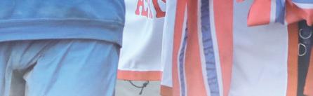 Hvit m/blått skulderstykke-mansjetter, gul krage, reklame