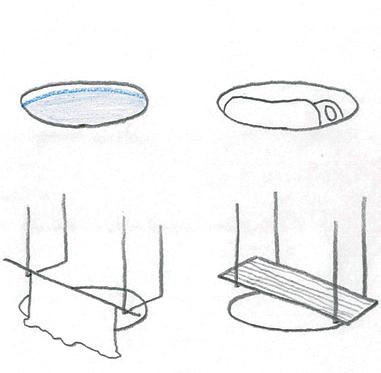 天井から垂れ下がるフックには様々な用途があります。 唯一の蛇口を掛けるのはもちろん、照明や間仕切り布、板 やモノも掛けることができます。
