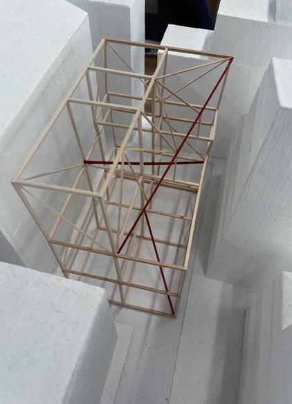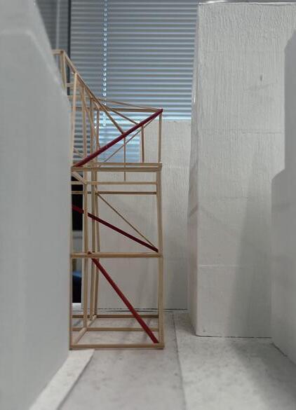 密集地では現場の工期が長くなればなるほどそれだけ搬入費そして人件費がより多くかかっ てしまうことと、キーワードの「巡る建築」という言葉の孕む意味から鉄骨造、それもピン 接合とした。そうすることで施工期間を短くし、解体を容易としさらには解体されてもそれ が再び資材として「巡る」かたちで利用が可能な構造とした。