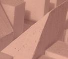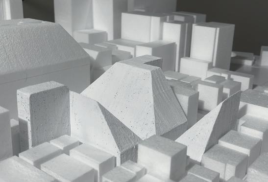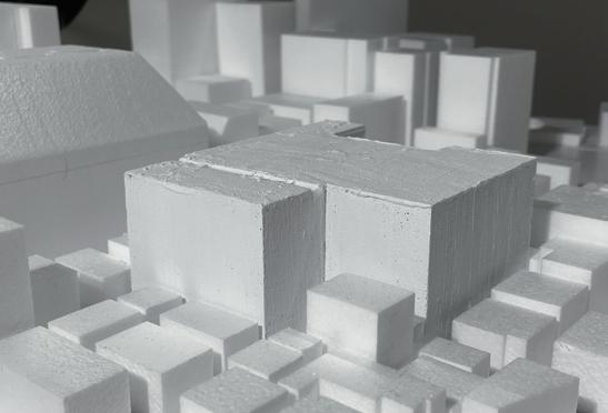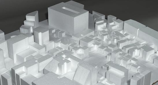 そこで、これの影響がどれほど作用するのかを視覚的にわかりやすくするために、 1/300の模型によりスタディをおこなった。このボリュームの占める空間が建築物を 建てることができる範囲を表している。はじめに、現在、駐車場として利用されてい る設計対象地A、B、Cの三つに斜線制限を考慮して上記の表すボリュームをつくった。